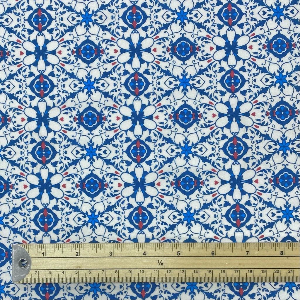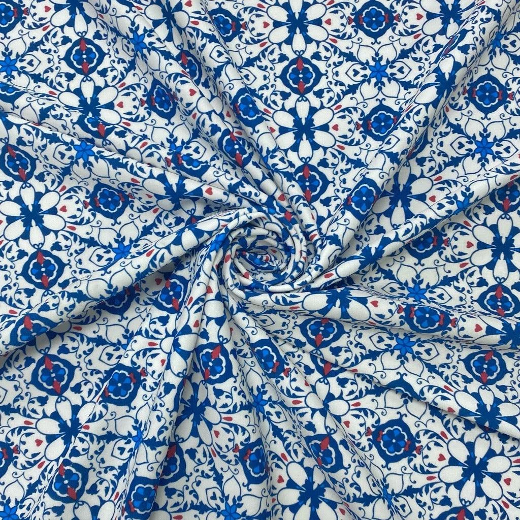 A nylon spandex fabric featuring a blue and red abstract floral print on a white background. Lycra Spandex is durable and breathable and is very comfortable to wear. This fabric has 4 way stretch and a wonderful shine. Lycra spandex dries quickly compared to many other fabrics.Â