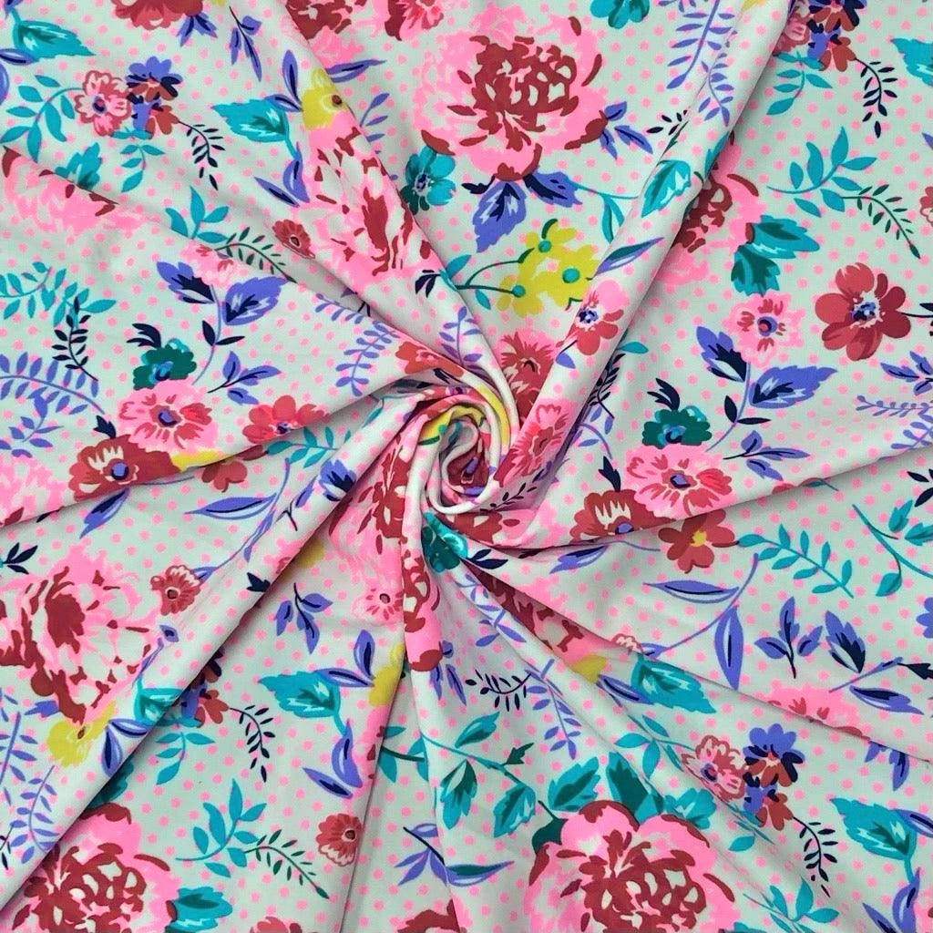 A nylon spandex fabric featuring a floral and polka dots print. Lycra Spandex is durable and breathable and is very comfortable to wear. This fabric has 4 way stretch and a wonderful shine. Lycra spandex dries quickly compared to many other fabrics.