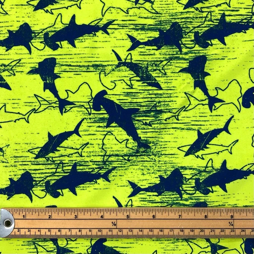 Navy Sharks on Neon Yellow Lycra Spandex Fabric – now available at the UK’s lowest price!