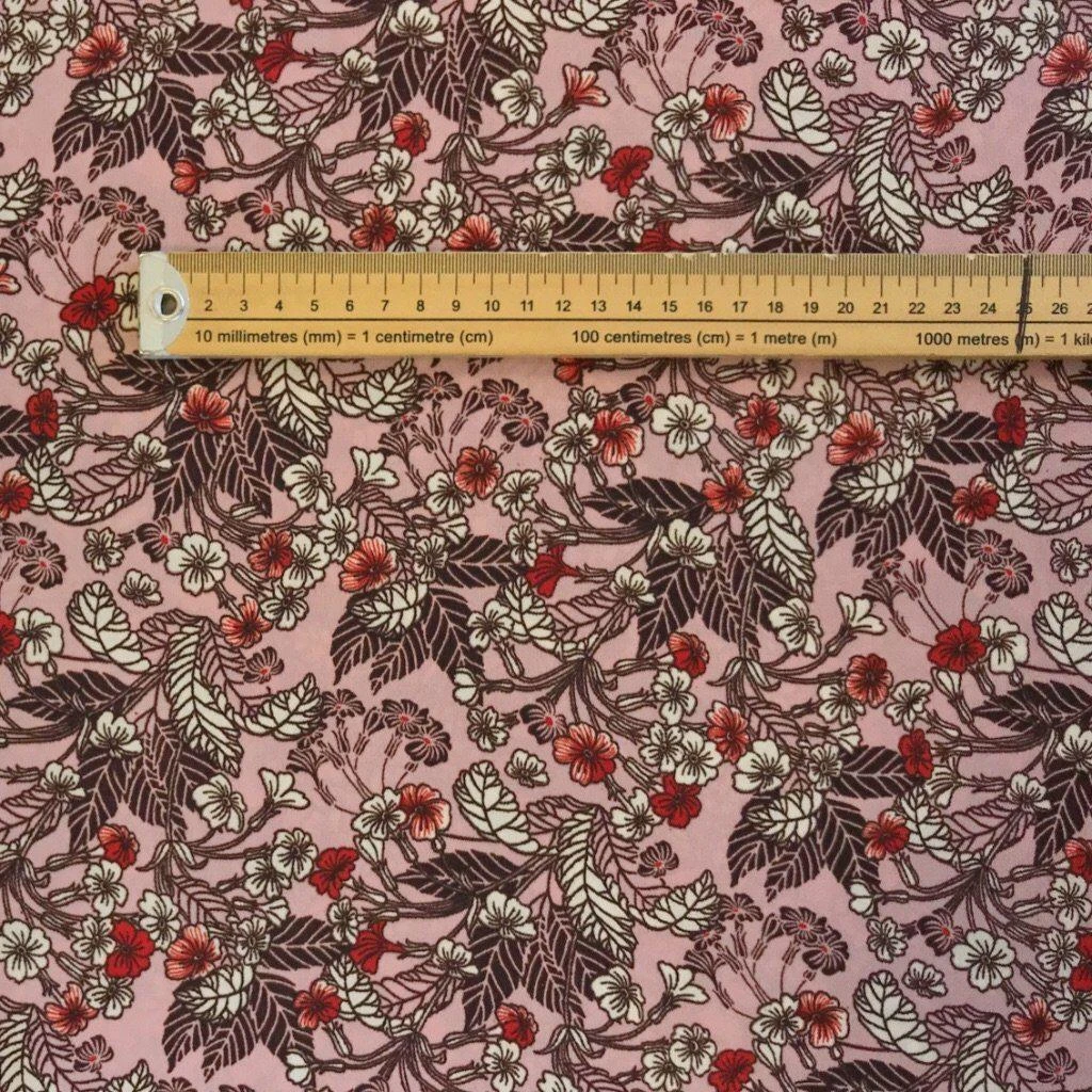 A high quality printed polyester fabric featuring a floral design. Available in three background colours: Lilac, Beige, Pink.
