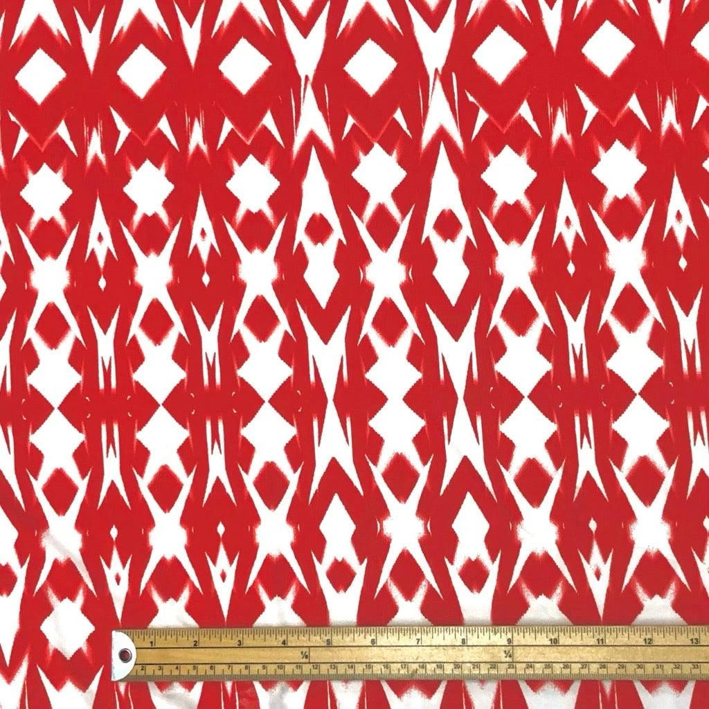 White Geometric Patterns on Red Lycra Spandex Fabric – now available at the UK’s lowest price!