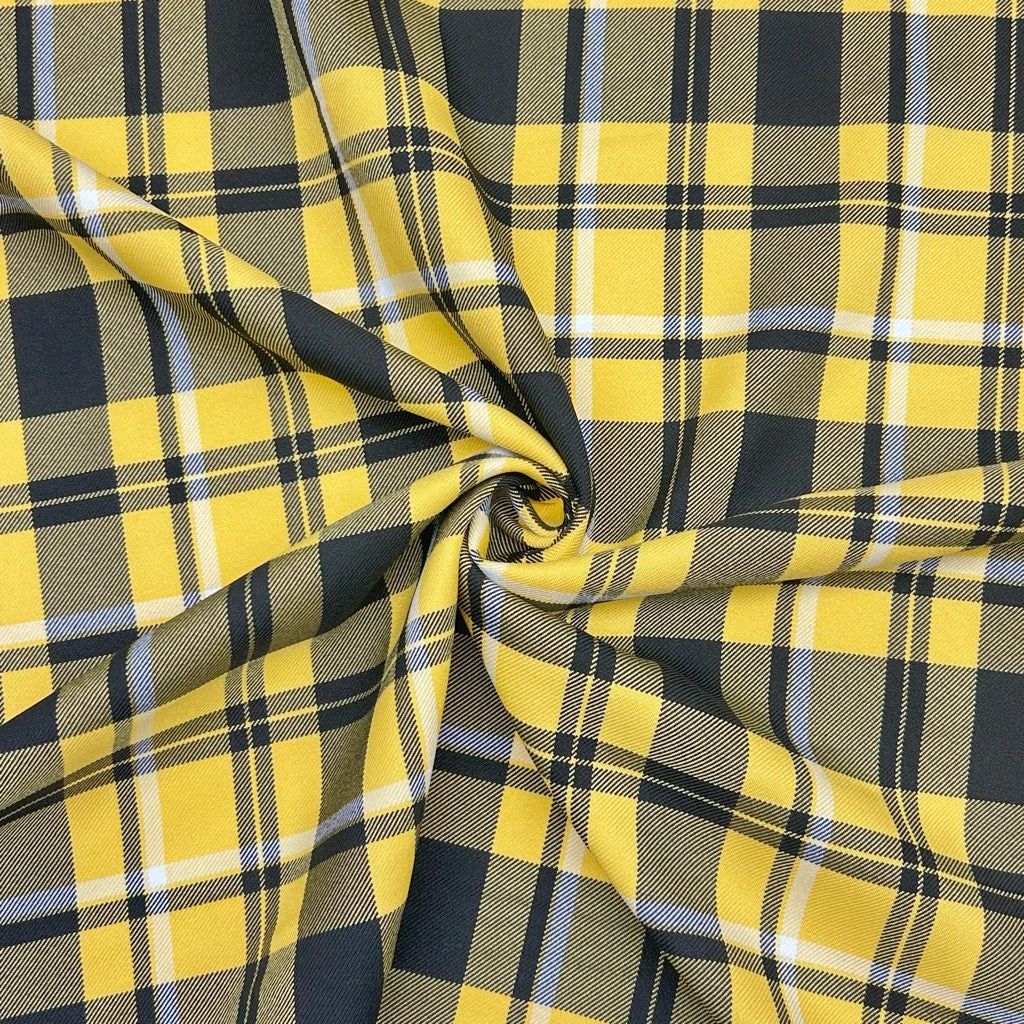 A quality woven polyester suiting fabric featuring a yellow and black checkered design. Suitable for trousers, skirts, business wear, blazers and more!Â