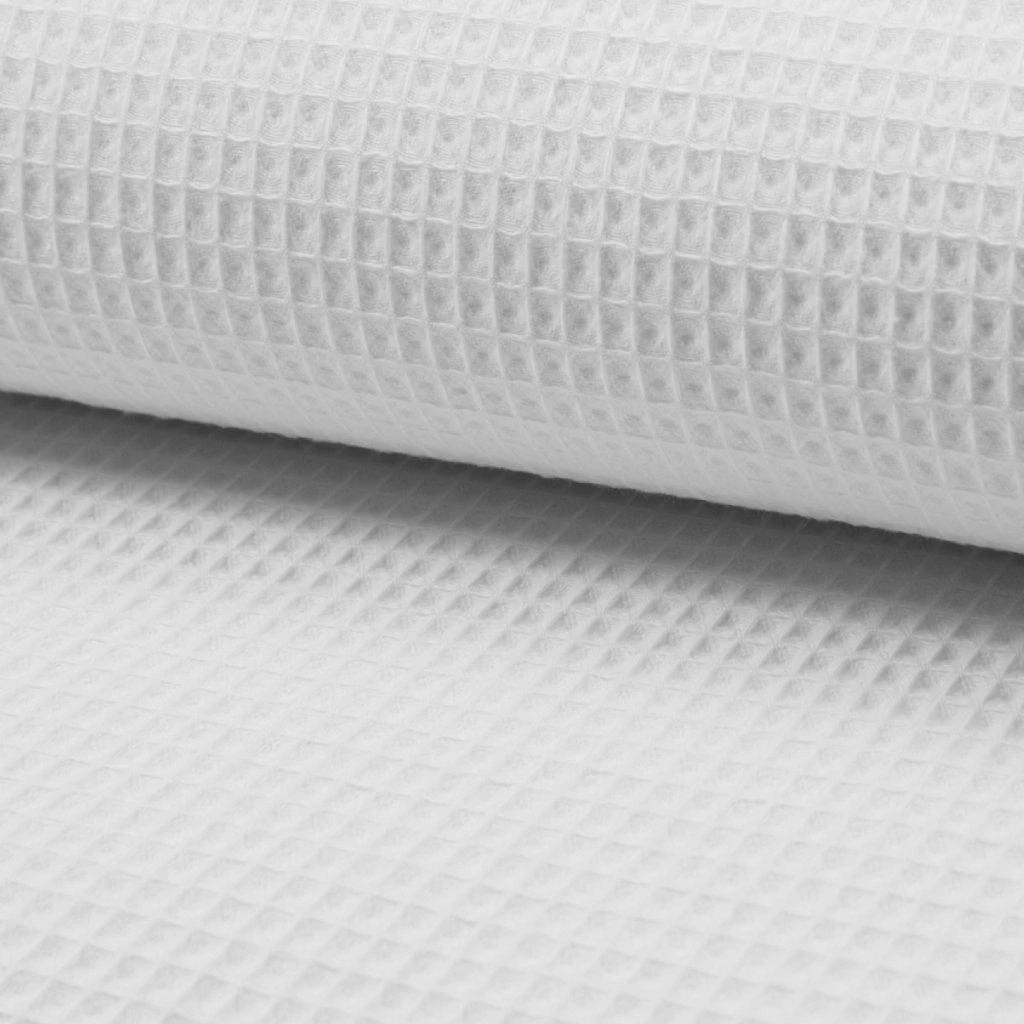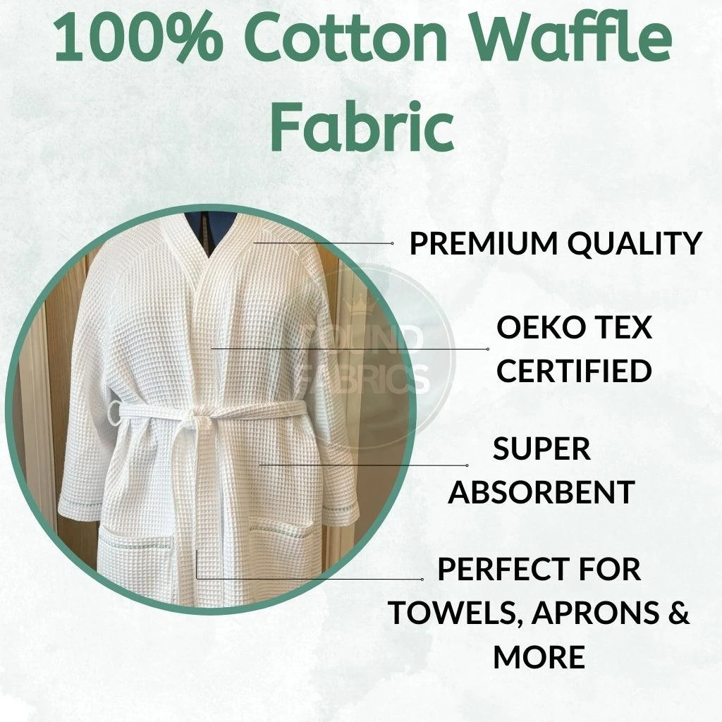 Waffle fabric is a woven fabric that has a recessed pattern created by cords running vertically and horizontally which creates a square design (hence the name waffle). Waffle fabric is woven in a way that makes it very absorbent, but it also allows air to flow through so it dries quickly. Waffle fabric, sometimes also called honeycomb fabric is ideal for a range of garments such as towels, aprons, robes, slippers etc.
