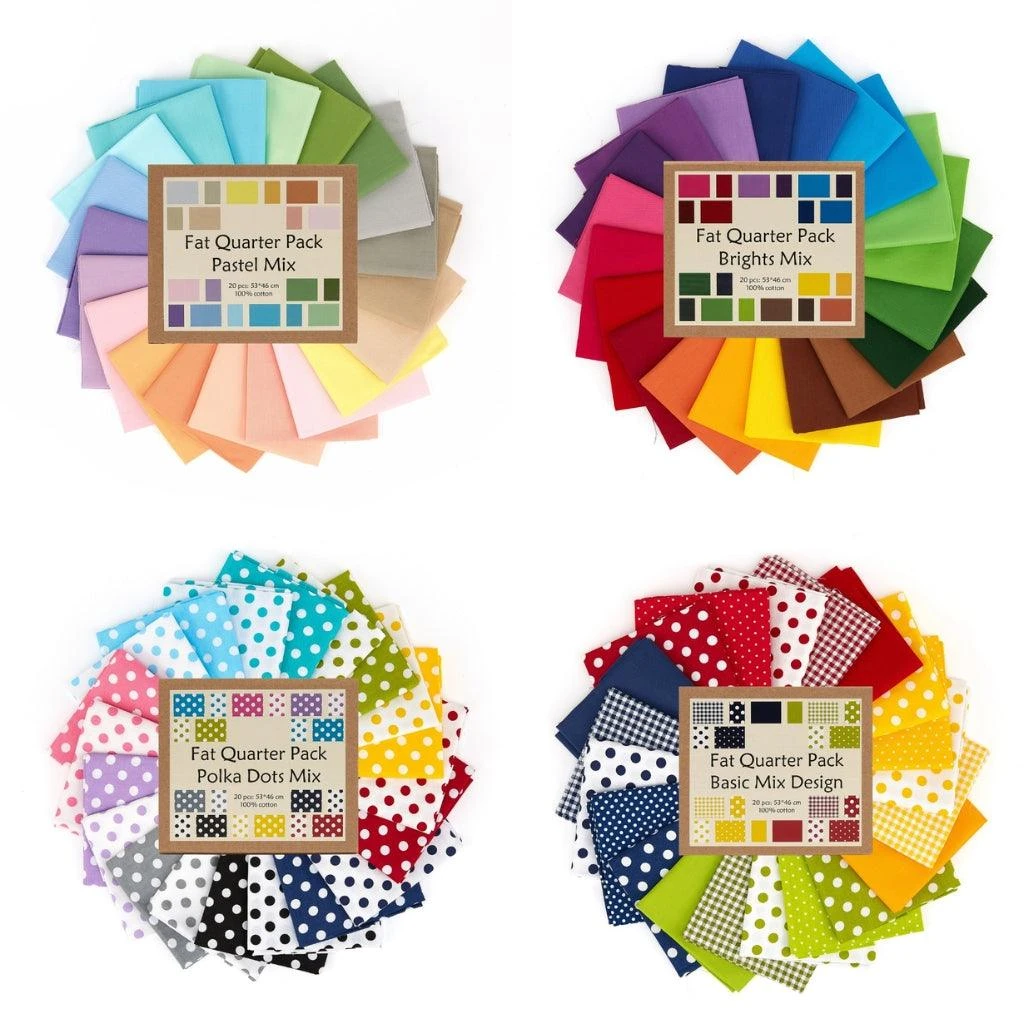 Our 20 Piece Cotton Fat Quarter Bundle Box is available in: Pastel Mix, Bright Mix, Polka Dot Mix, Basic Mix, Pastel Design Mix.