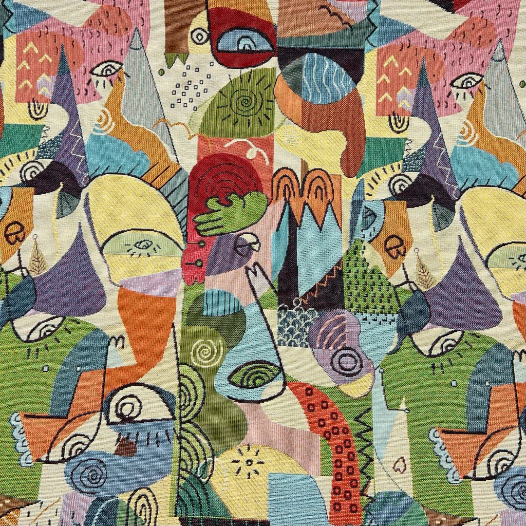 A tapestry fabric with a Picasso style ‘abstract faces’ design. Tapestry is a fine woven cloth, made by weaving coloured threads. The weave is built up to create a pattern and can often be reversible. Suitable for home soft furnishing such as curtains, upholstery and bedspreads, cushions and bean bags etc. This fabric will add texture and vibrance into your home!