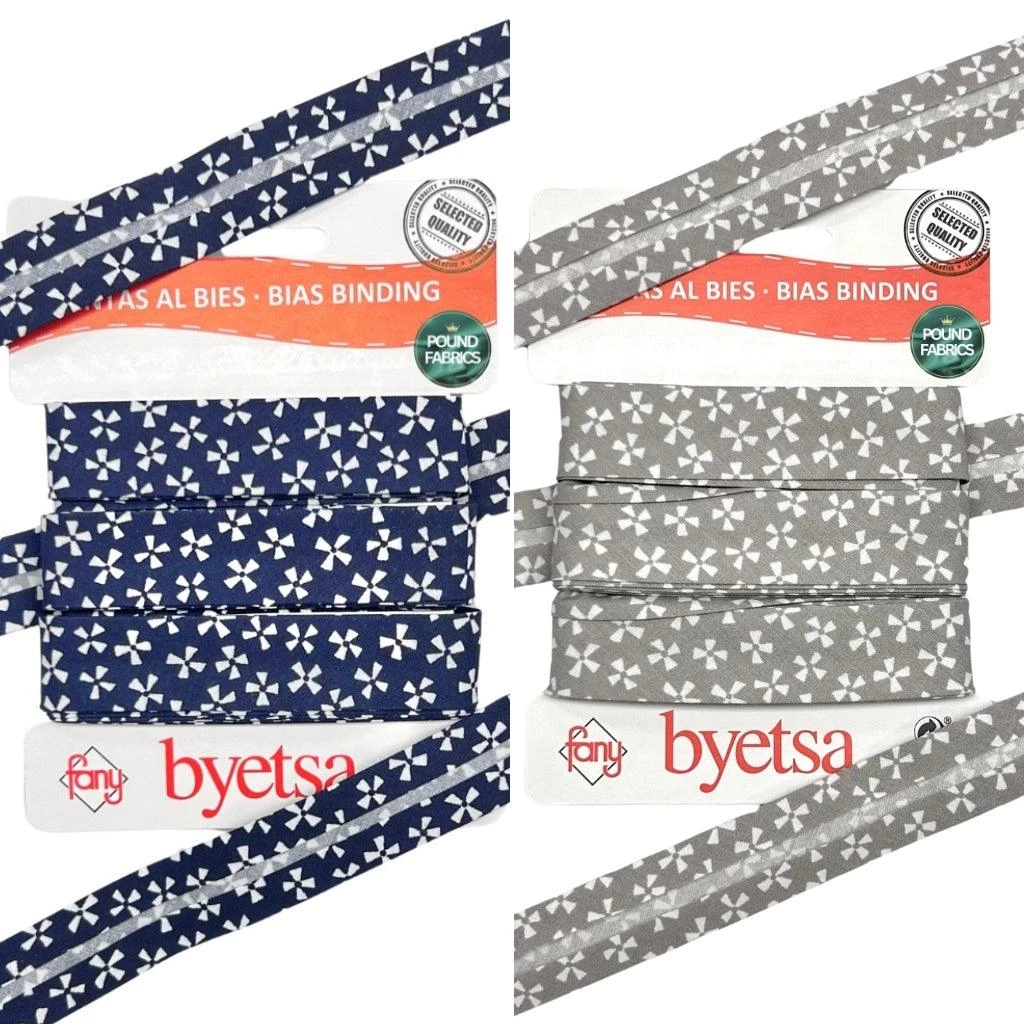 A quality 100% organic cotton folded bias binding tape featuring a white, abstract flowers print available in 2 colours.