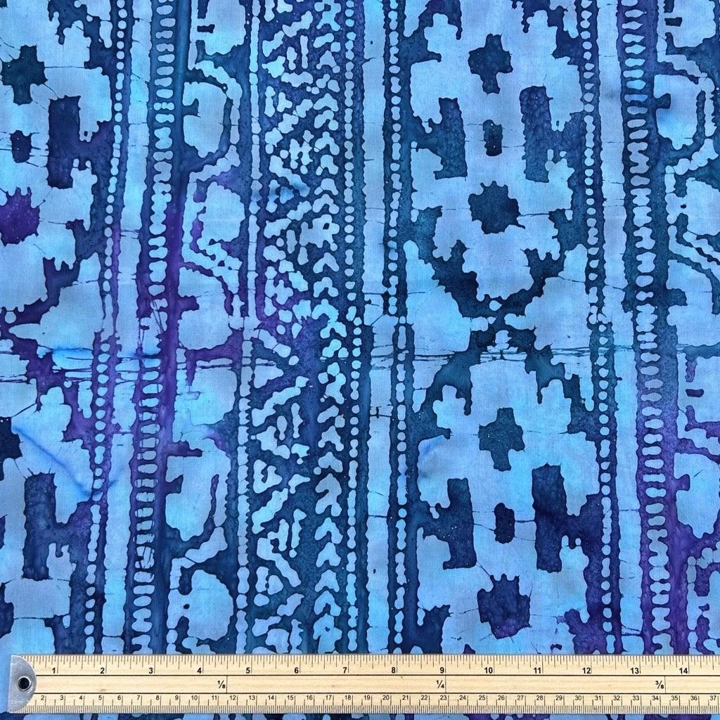 A high quality 100% cotton batik fabric featuring abstract navy stripes on a blue background. This John Louden fabric features a unique design with deep colours, hand printed by specialist craftsmen.