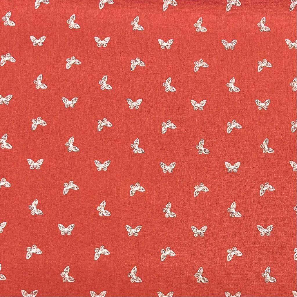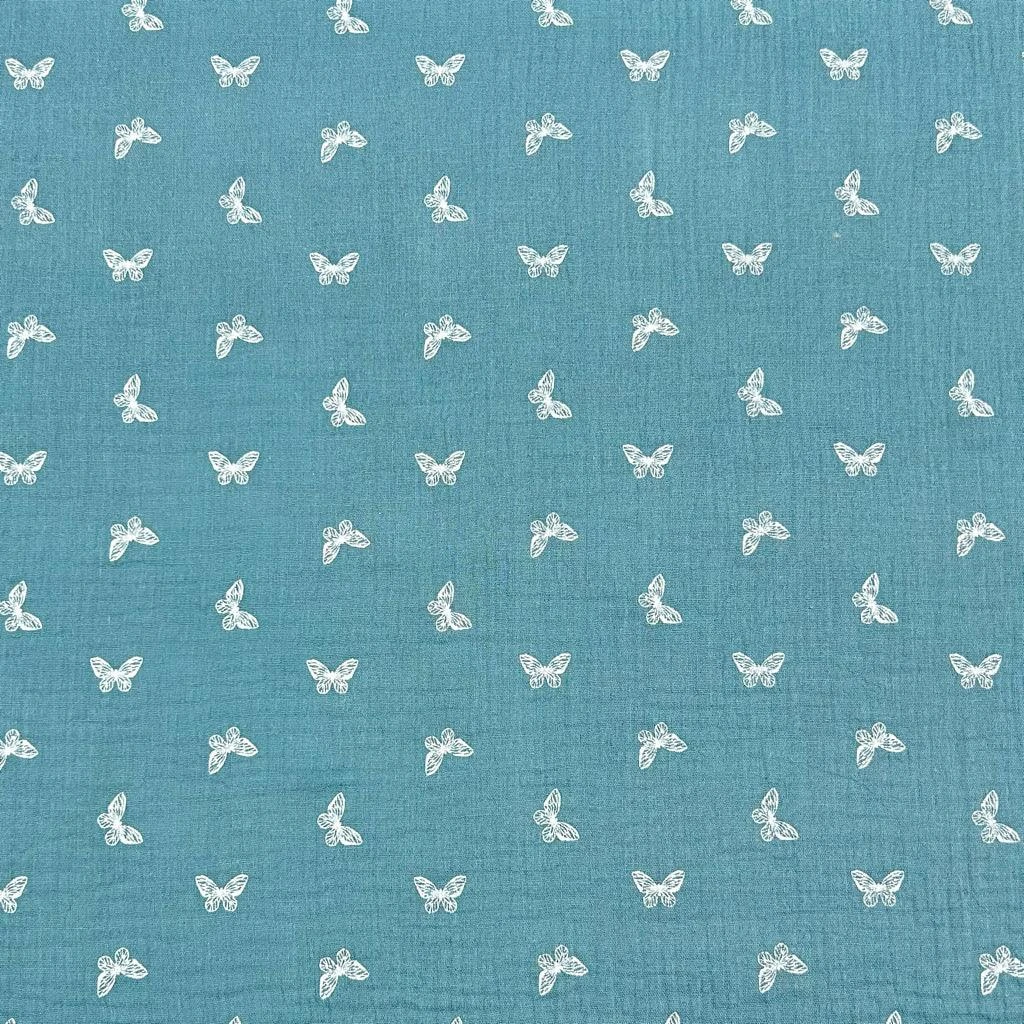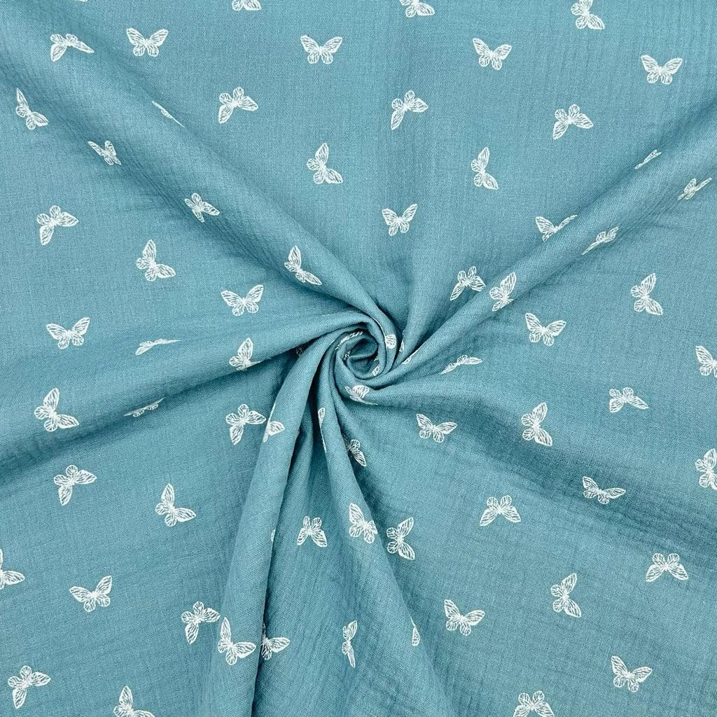 A high quality double gauze fabric featuring a butterfly print, available in 3 colours: Terracotta, Wine and Blue. Double gauze is a breathable and soft fabric, which is made from two layers of muslin. They are attached together with tiny stab stitches in a grid pattern at regular intervals, however this is barely visible.Â