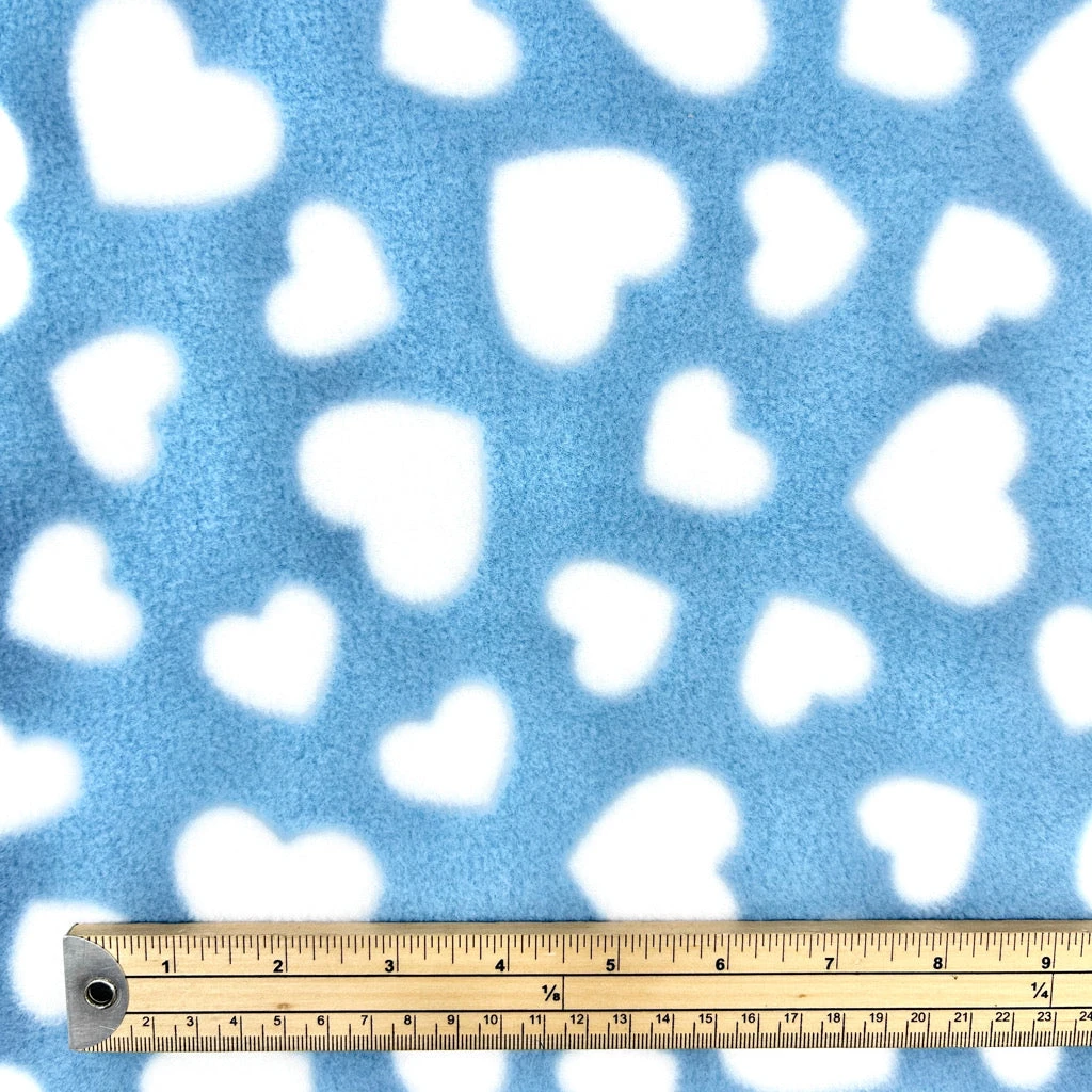 A high quality polar fleece fabric featuring a hearts design on a blue background. This fabric has a lovely feel on the skin as the fabric is very soft to touch. As this is an anti pill polar fleece, it prevents prevents bobbling.Â