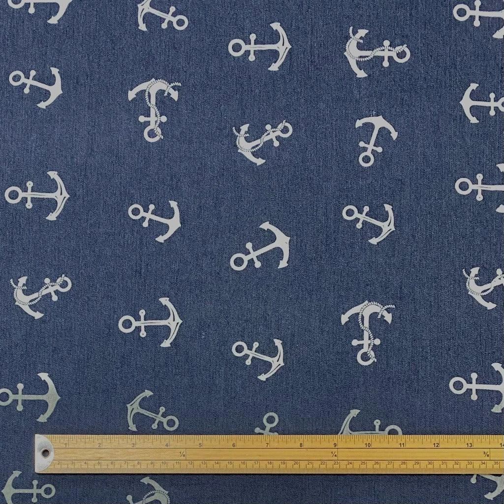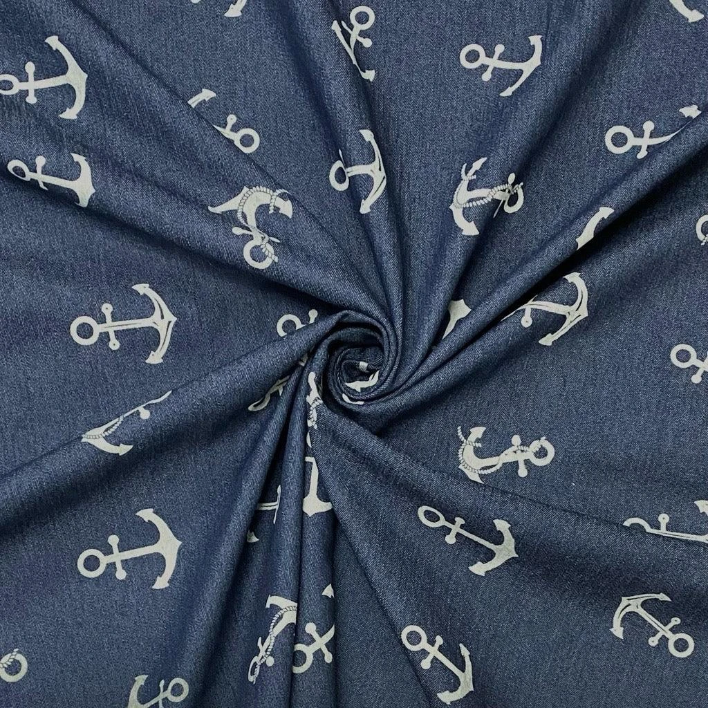 This denim fabric features anchors in its design. This fabric is slightly heavier than our chambray denim fabrics and would be perfect for shirts, dresses, skirts, etc. This may also be suitable for a lightweight pair of jeans.