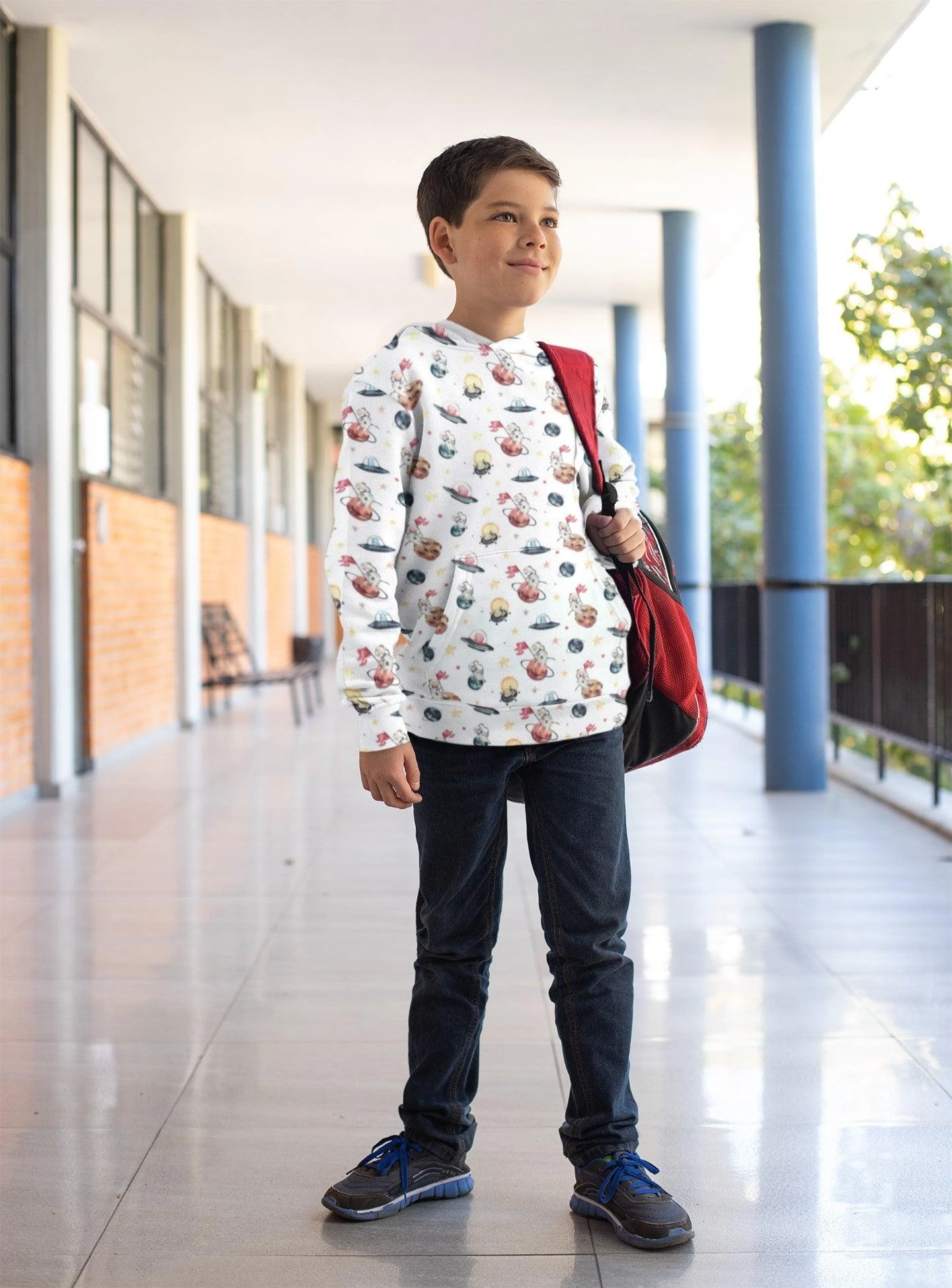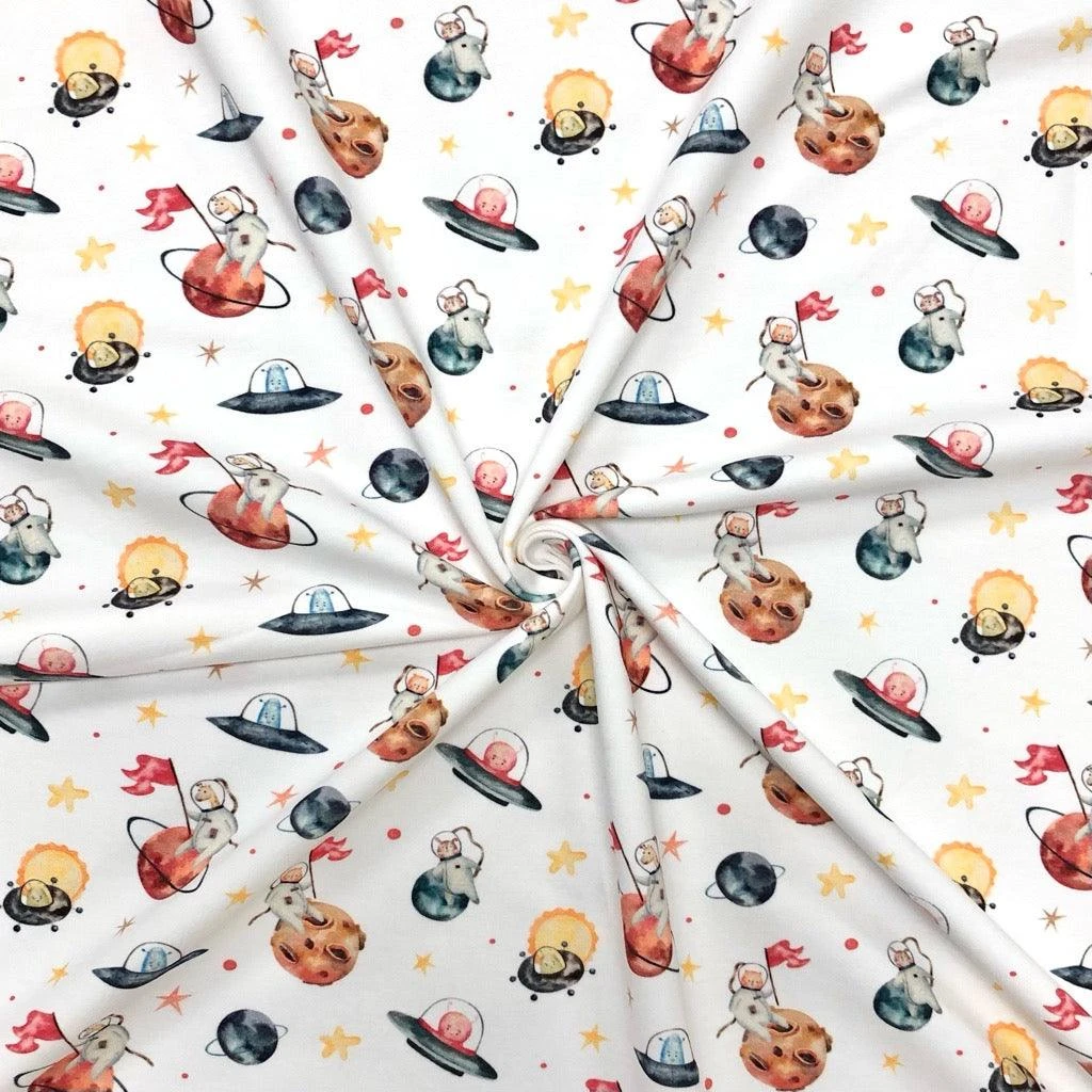 A Digital French Terry fabric featuring an animal and planet print on a white background. French Terry, also known as loop back jersey has small loops/piles of yarn on the reverse side, giving it extra comfort and warmth. This fabric has 4 way stretch and would be suitable for sweatshirts, hoodies, pyjamas, tops, leggings and more!