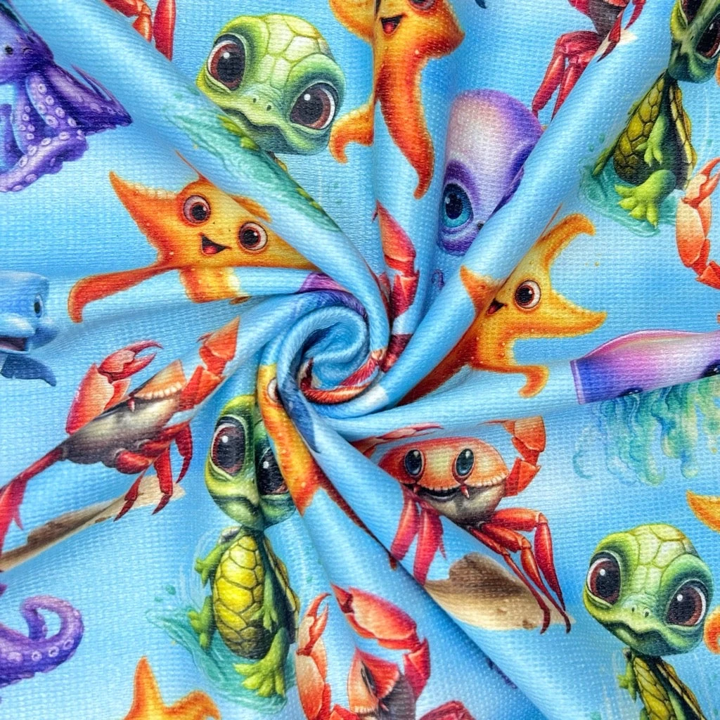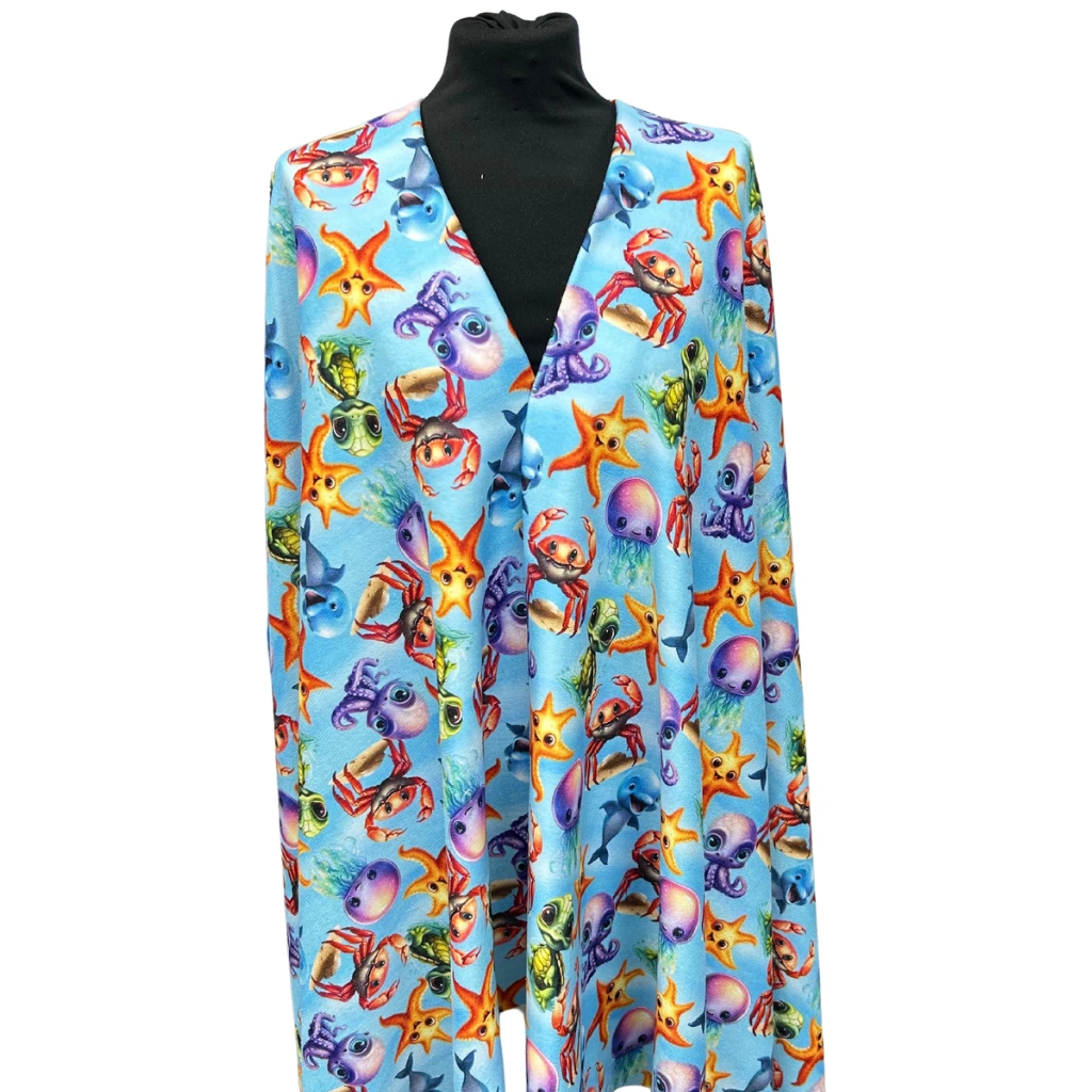 A fun and colourful, digitally printed cotton towelling fabric featuring a sea animals print. It is soft, breathable, and comfortable against the skin. It is also highly absorbent due to its characteristic looped texture. Ideal for baby towels, bibs, bathrobes, beach towels, dressing gowns, and much more.