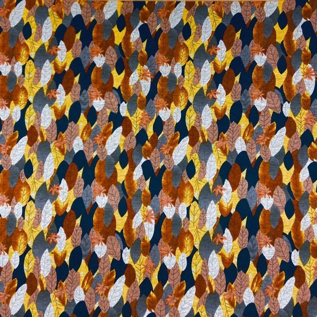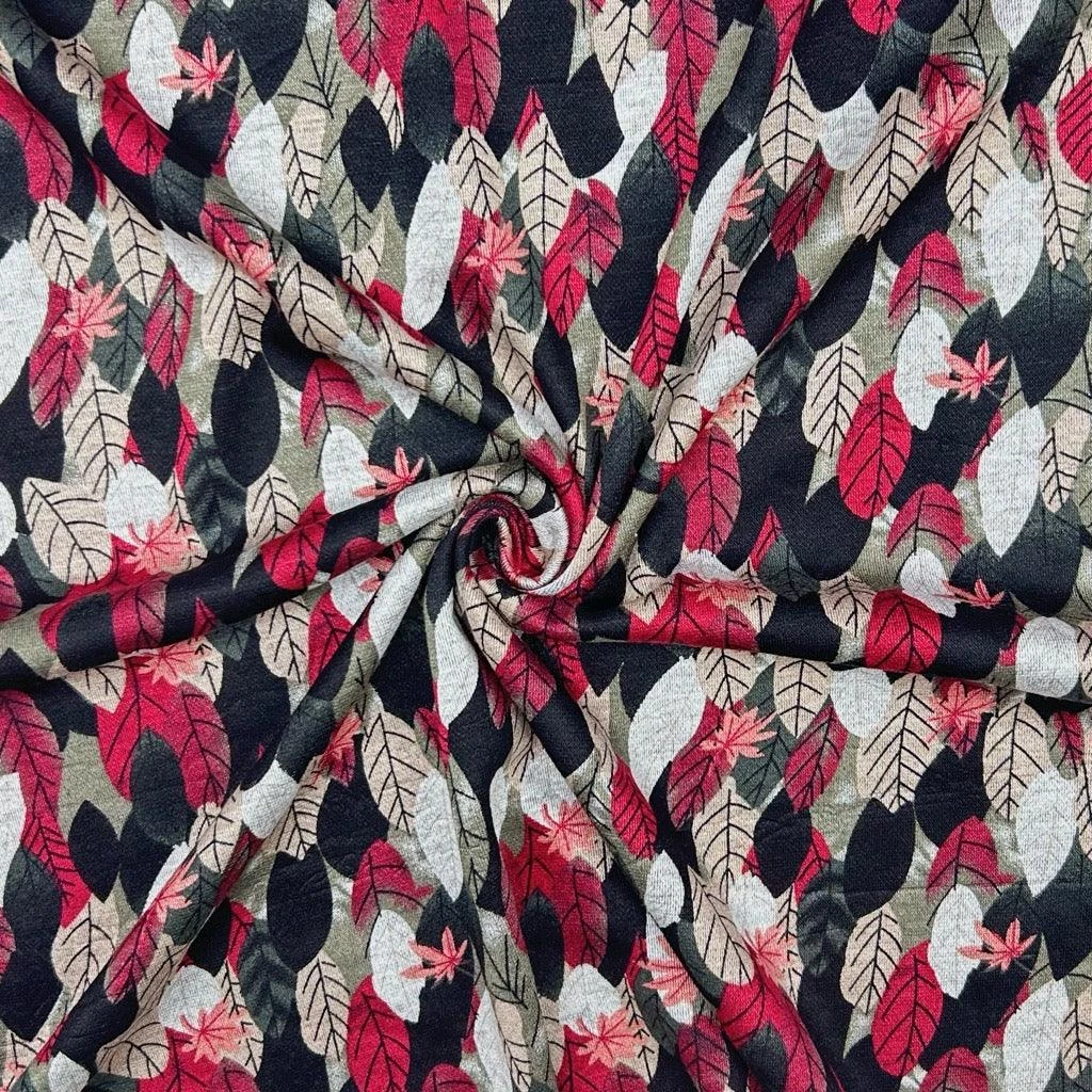 This modal-feel jersey fabric features a gorgeous pattern of leaves. This soft fabric is comfortable to wear and features a lovely stretch across the width. Suitable for a range of dress making projects such as tops, dresses, sweaters and other winter projects.Â