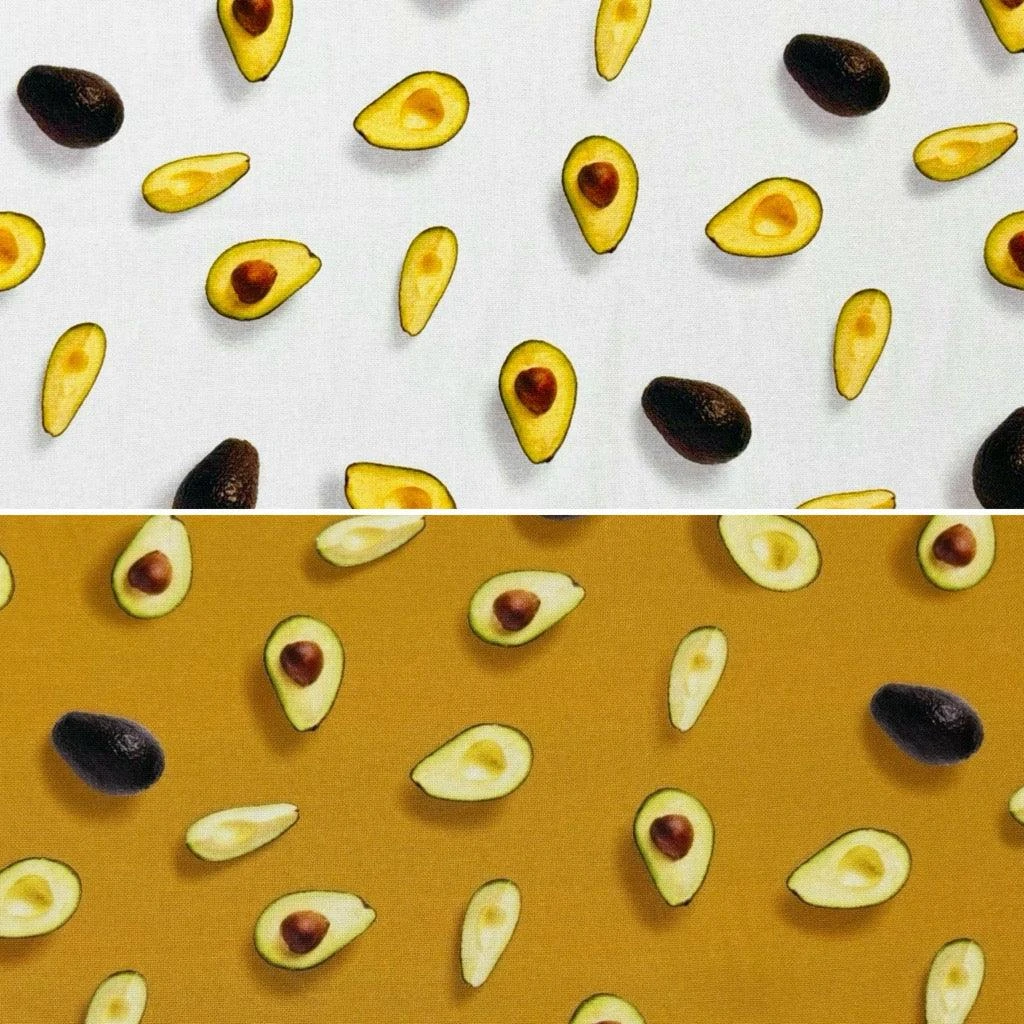 A medium weight gorgeous digitally printed cotton canvas fabric featuring an avocados design available in 2 colours. This durable fabric is suitable for bags, dresses, skirts, accessories and more!