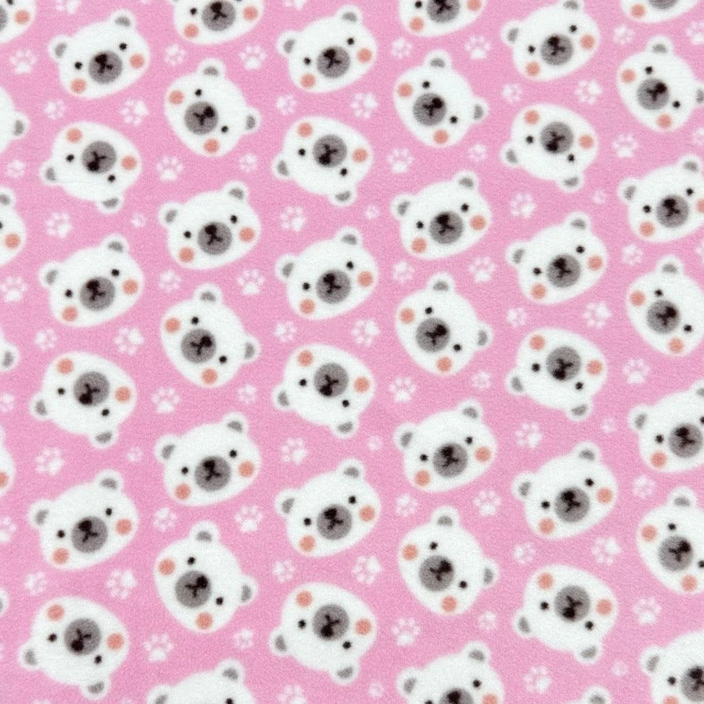 A lovely polar fleece fabric featuring a bear faces and paw prints design, available in 3 colours. This fabric features a minimal stretch across the width, is comfortable to wear and has a lovely feel on the skin as it is very soft to touch. As this is an anti pill polar fleece, it prevents bobbling.Â