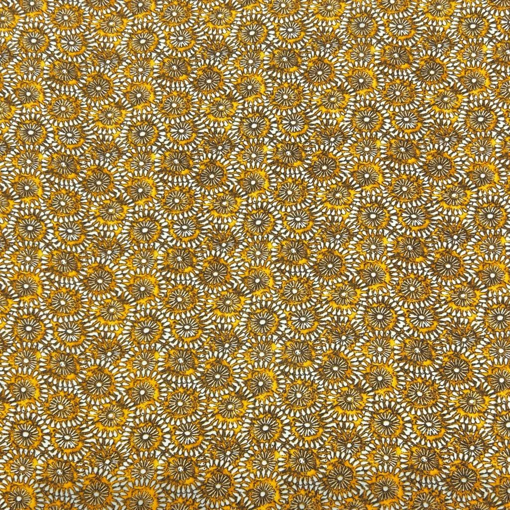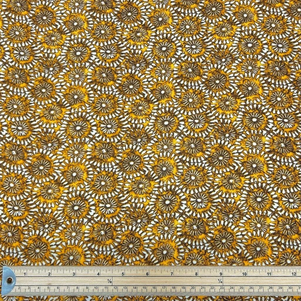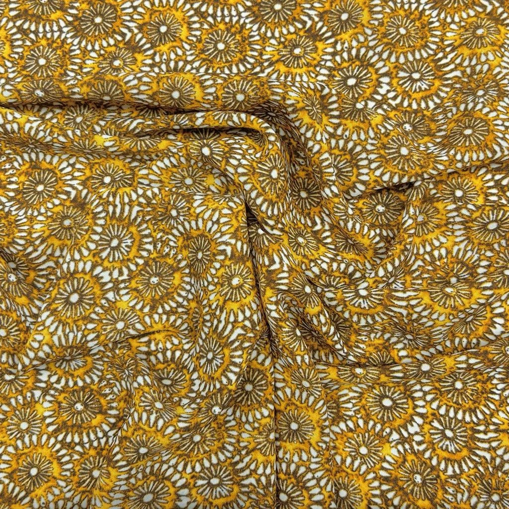 A lightweight polyester crepe fabric featuring a mustard floral design. This fabric would be suitable for a range of dressmaking projects such as tops, dresses, trousers, skirts and more!