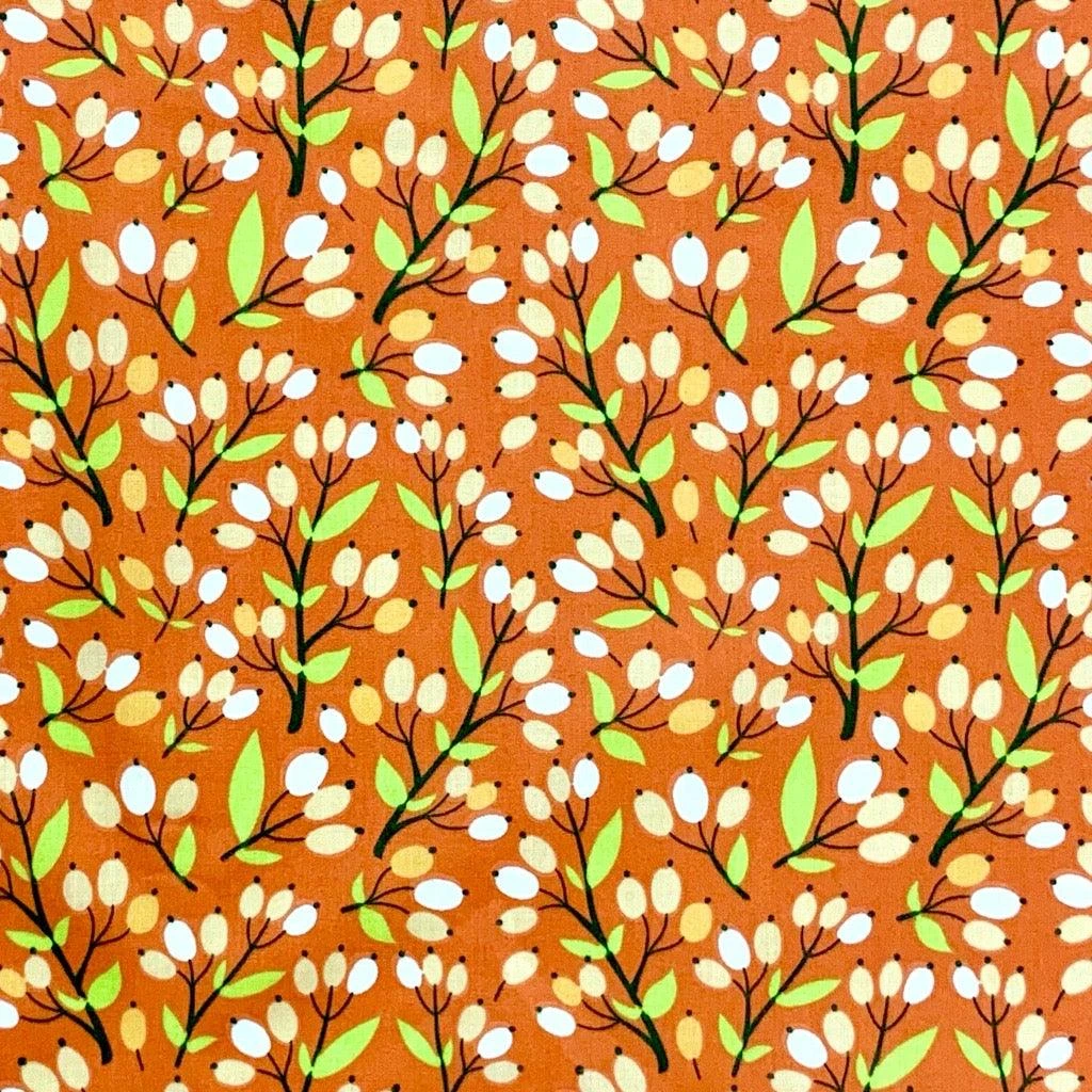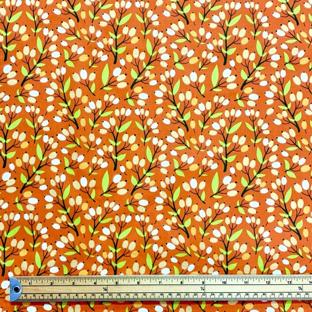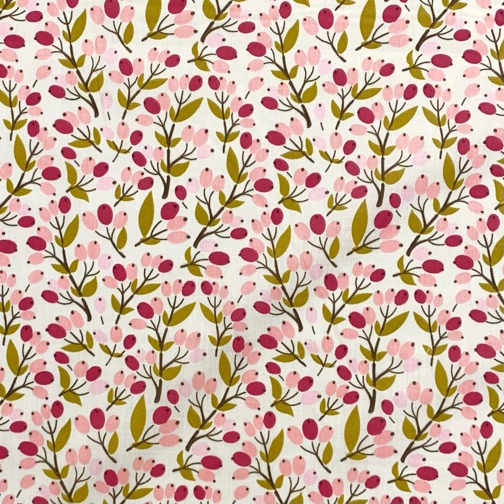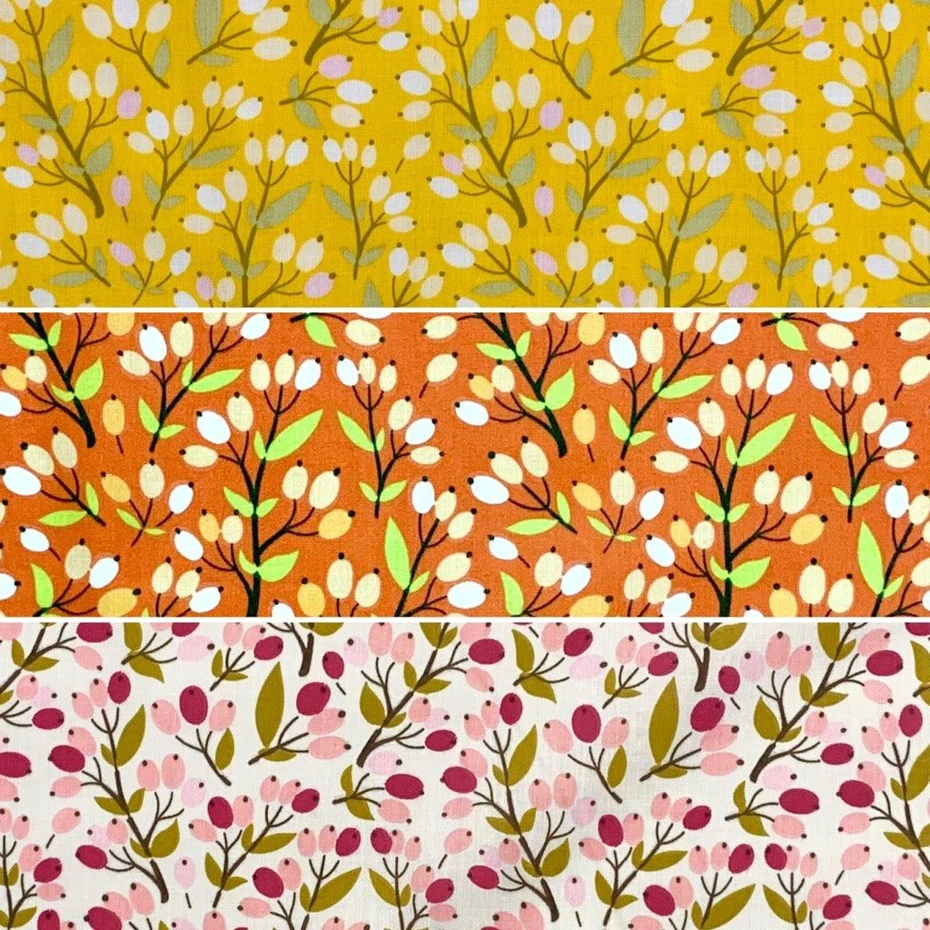 A lightweight polycotton fabric featuring a berry design available in 3 colorways. Suitable for a range of dressmaking and craft projects!