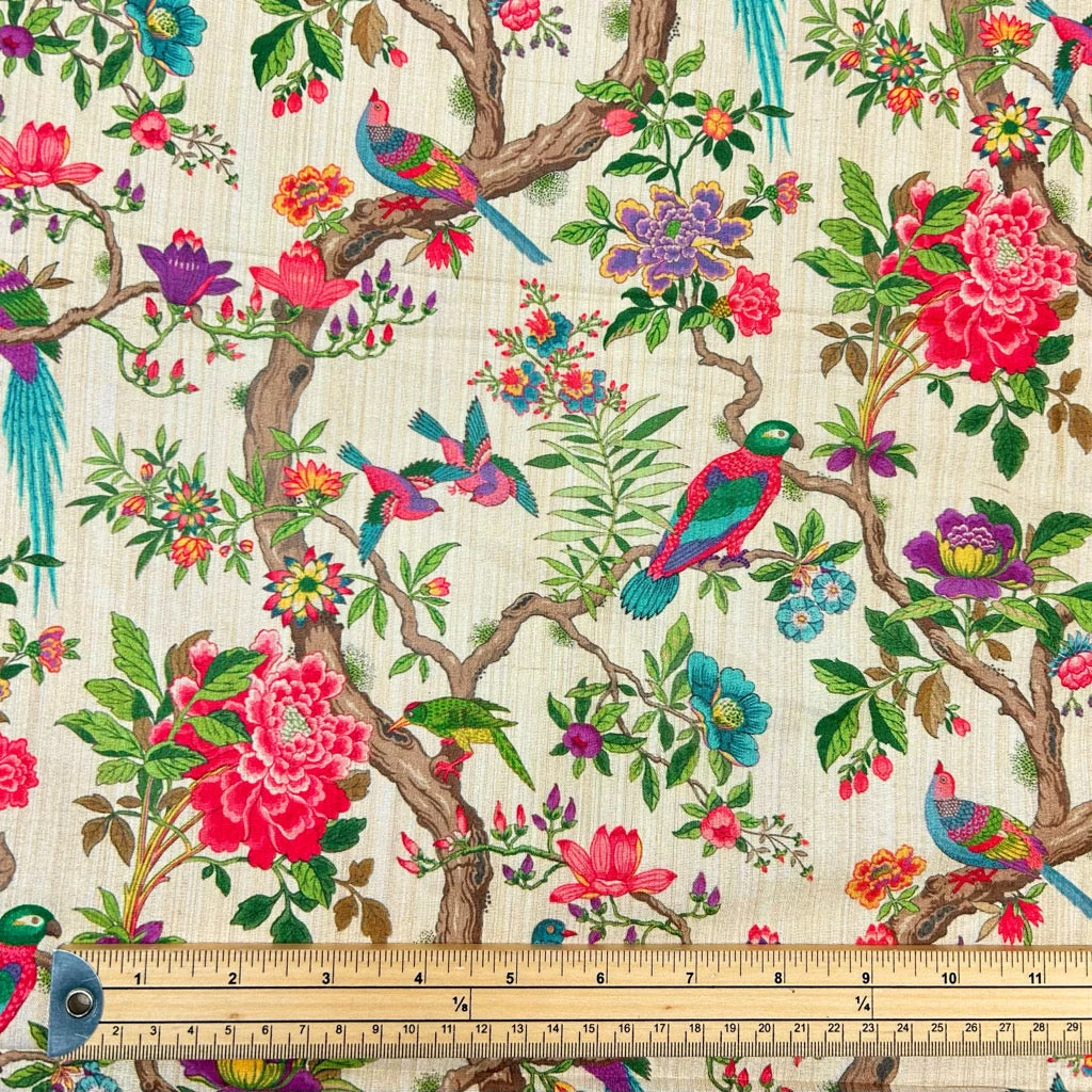 This lightweight fabric features a vibrant print depicting flowers and birds in nature. It has a beautiful drape and a soft yet slightly textured feel, mimicking the natural elegance of real silk. The blend of bamboo and viscose in this fabric gives it a silky smooth finish with a subtle sheen, while also enhancing breathability and comfort.