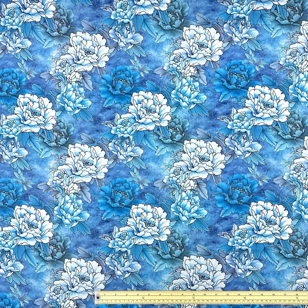 A high quality, digitally printed, 100% viscose fabric featuring a vibrant flower design. This fabric features a wonderful drape and would be perfect for summer tops, dresses, skirts, accessories and more!
