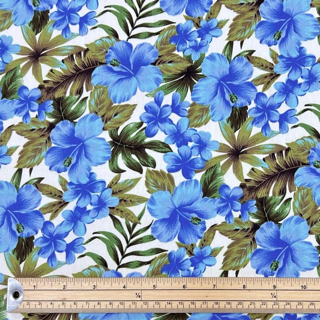 A Rose & Hubble cotton poplin fabric featuring a blue flowers and green leaves design on a white background. Suitable for tops, skirts, dresses, accessories and more!