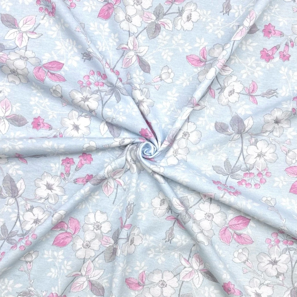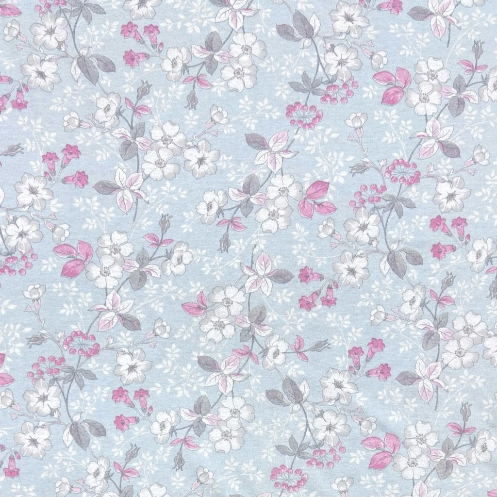 A high quality cotton knit fabric featuring a white, grey and pink flowers design on a blue background. This fabric would be great for a range of dressmaking projects such as tops, dresses, skirts, pyjamas and more.