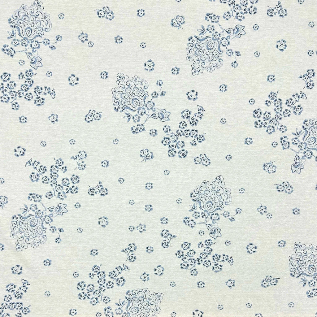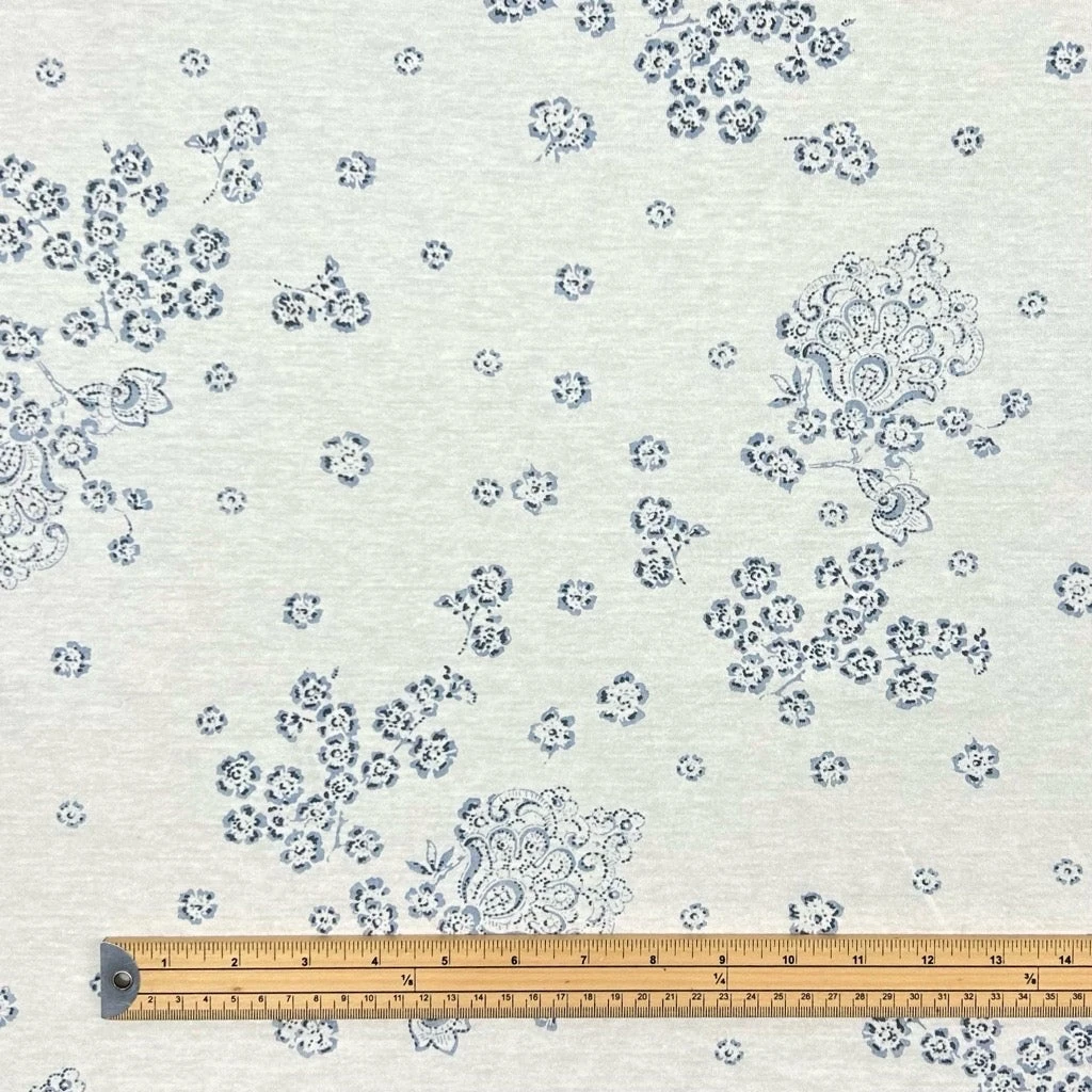 A light weight cotton knit fabric featuring a blue abstract patterns design with flowers on a cream background. This fabric is slightly sheer but would be great for a range of dressmaking projects.