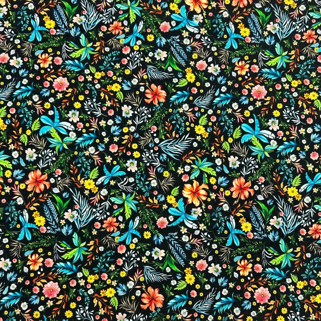 A high quality, printed bamboo cotton jersey with four-way stretch. This fabric features a multicoloured floral design of peach/orange/pink/yellow florals with teal and green leaves on a black background. It is incredibly soft and comfortable to wear, making it ideal for shirts, dresses, pyjamas and more!Â