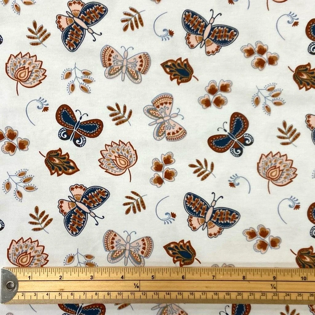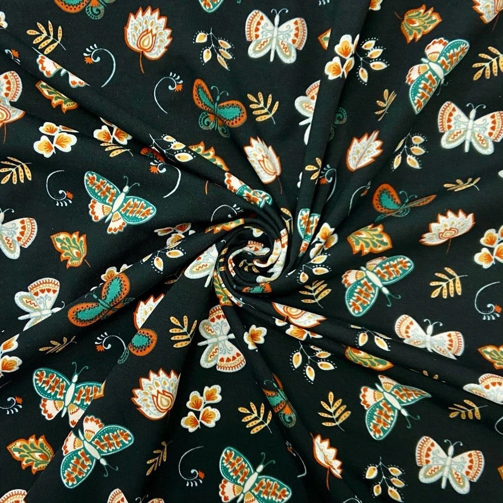A high quality cotton jersey fabric also known as cotton lycra, featuring a floral design with butterflies. This fabric is soft to touch and has 4 way stretch. Suitable for tops, leggings, dresses and more!