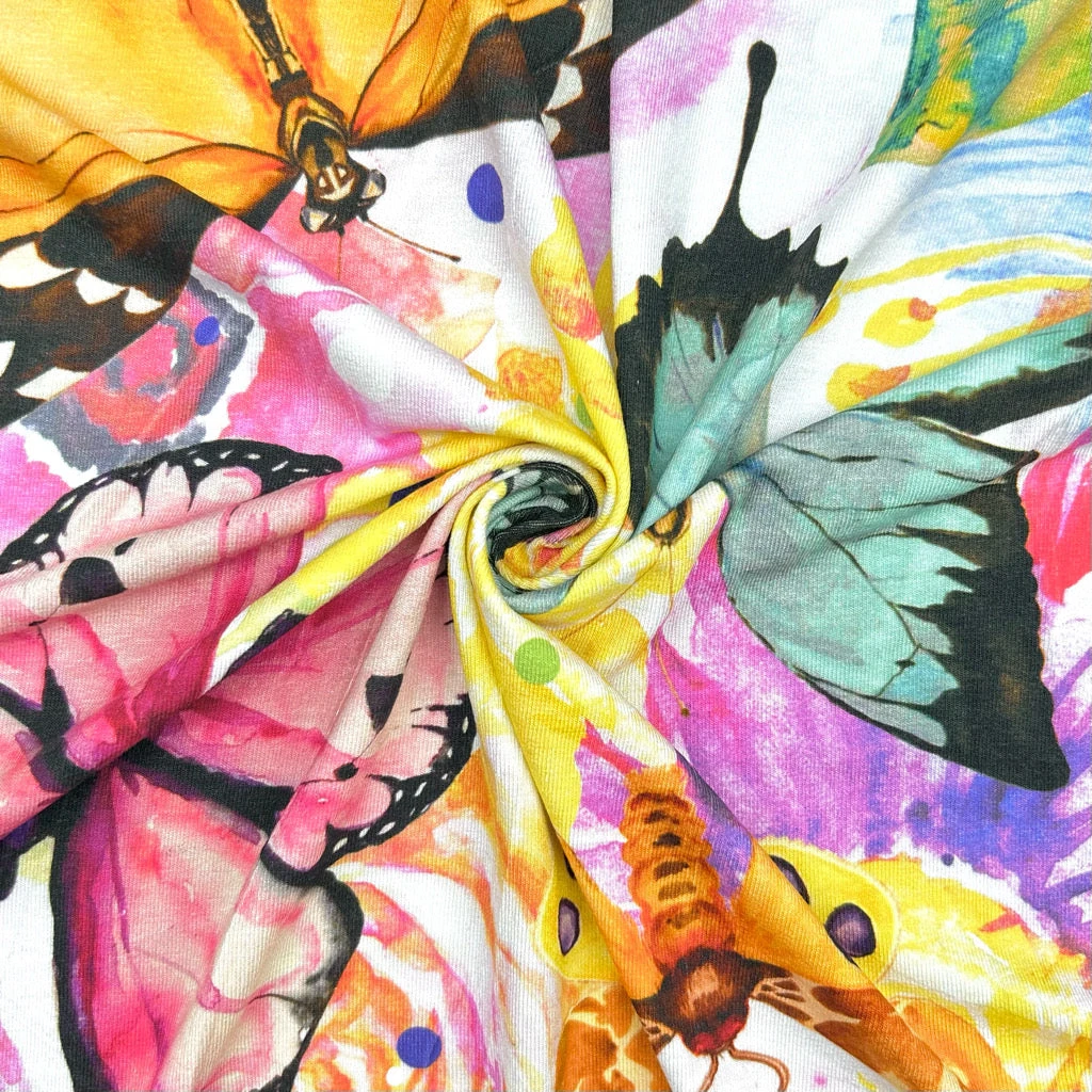 A medium-weight, digitally printed viscose jersey fabric featuring a butterfly print. This soft and breathable fabric has a wonderful drape and features a four way stretch, making it comfortable to wear. It is suitable for a range of dressmaking projects such as tops, dresses, skirts, pyjamas, and more.