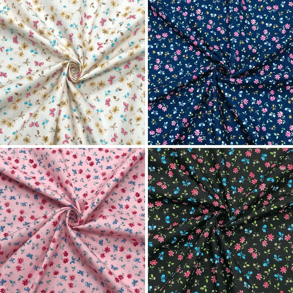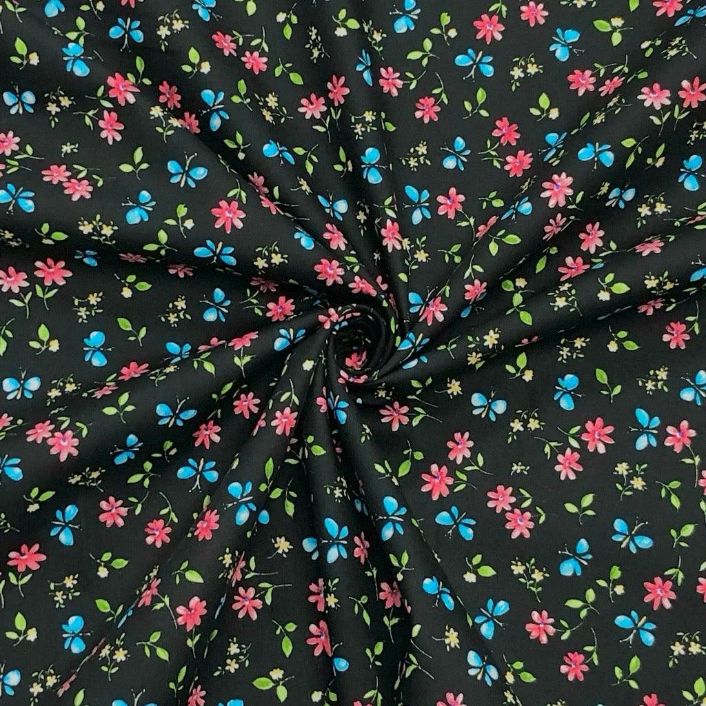 A Rose & Hubble cotton poplin fabric featuring butterflies and flowers available in 4 colours. Suitable for tops, skirts, dresses, accessories and more!