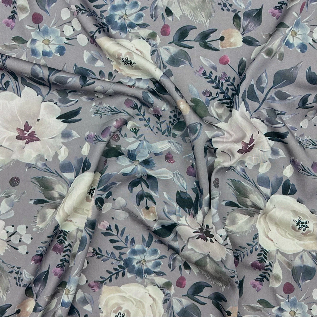 A high quality, digitally printed, viscose satin fabric featuring a flowers design. This fabric features a silky touch and lightweight drape, making it perfect for summer tops, dresses, skirts, accessories and more! Available in 3 colours.