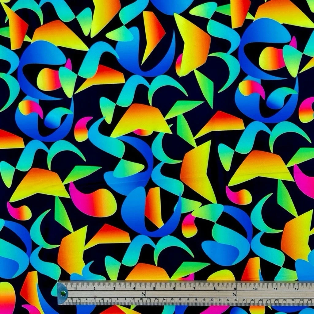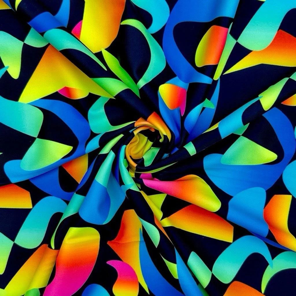 A digitally printed, medium weight jersey fabric featuring a multicoloured, abstract design. This fabric is durable and stretchy, making it perfect for yoga/gym leggings, dance wear and workout clothing.
