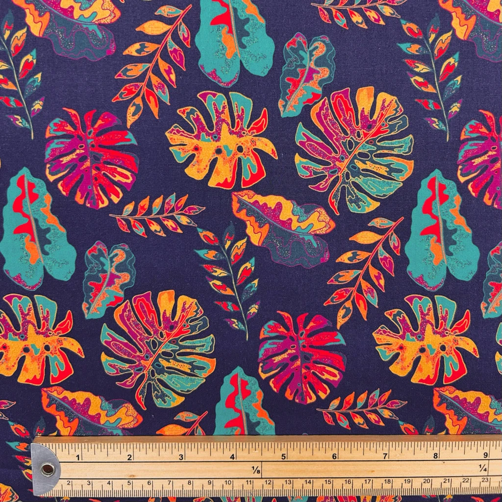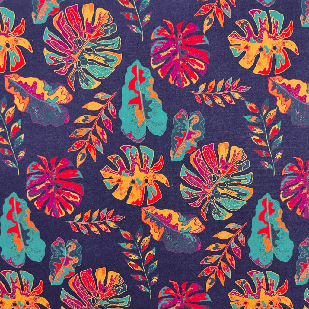 A Rose & Hubble printed cotton poplin fabric featuring a leaves pattern on purple background. This fabric would be suitable for a range of dressmaking projects such as tops, dresses, and skirts, as well as quilting and crafting projects!