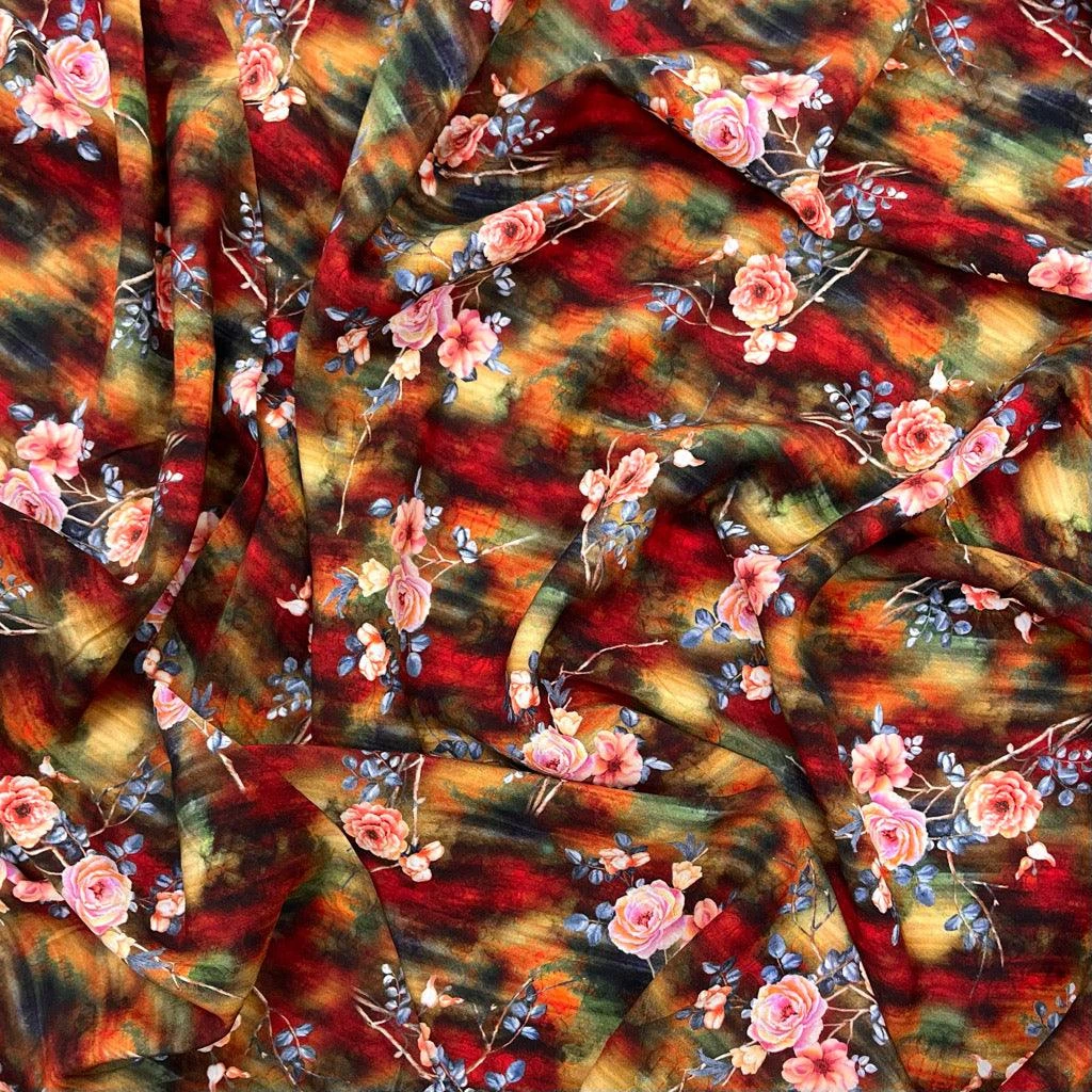A Digitally Printed viscose challis fabric featuring a floral print. Suitable for tops, dresses, skirts, accessories and more.