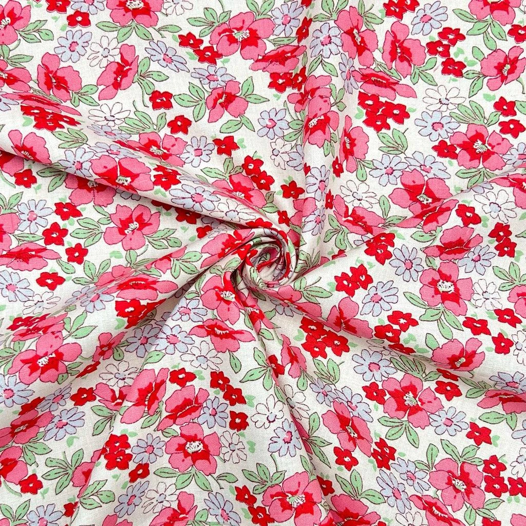 A linen and cotton blend fabric featuring a stunning floral design available in 2 colours. This fabric drapes well (not as much as our linen viscose) and doesn’t crease easily, it is easy to handle and would be ideal for dresses, tops, skirts, comfortable trousers and other summer clothing.