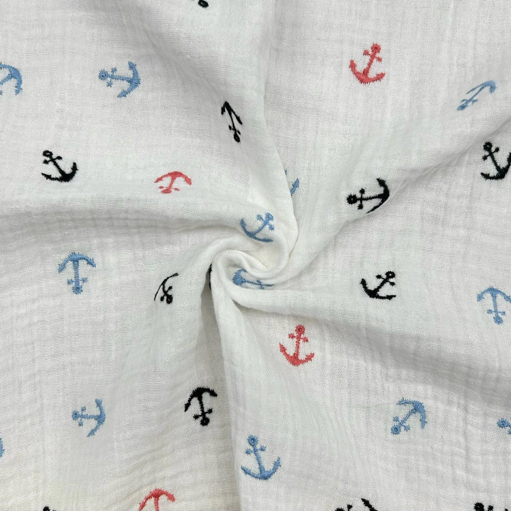 This fabric features an embroidered, multicoloured anchors design on an ivory/off-white background. Double gauze is a breathable and soft fabric, which is made from two layers of muslin. They are attached together with tiny stab stitches in a grid pattern at regular intervals, however this is barely visible.Â