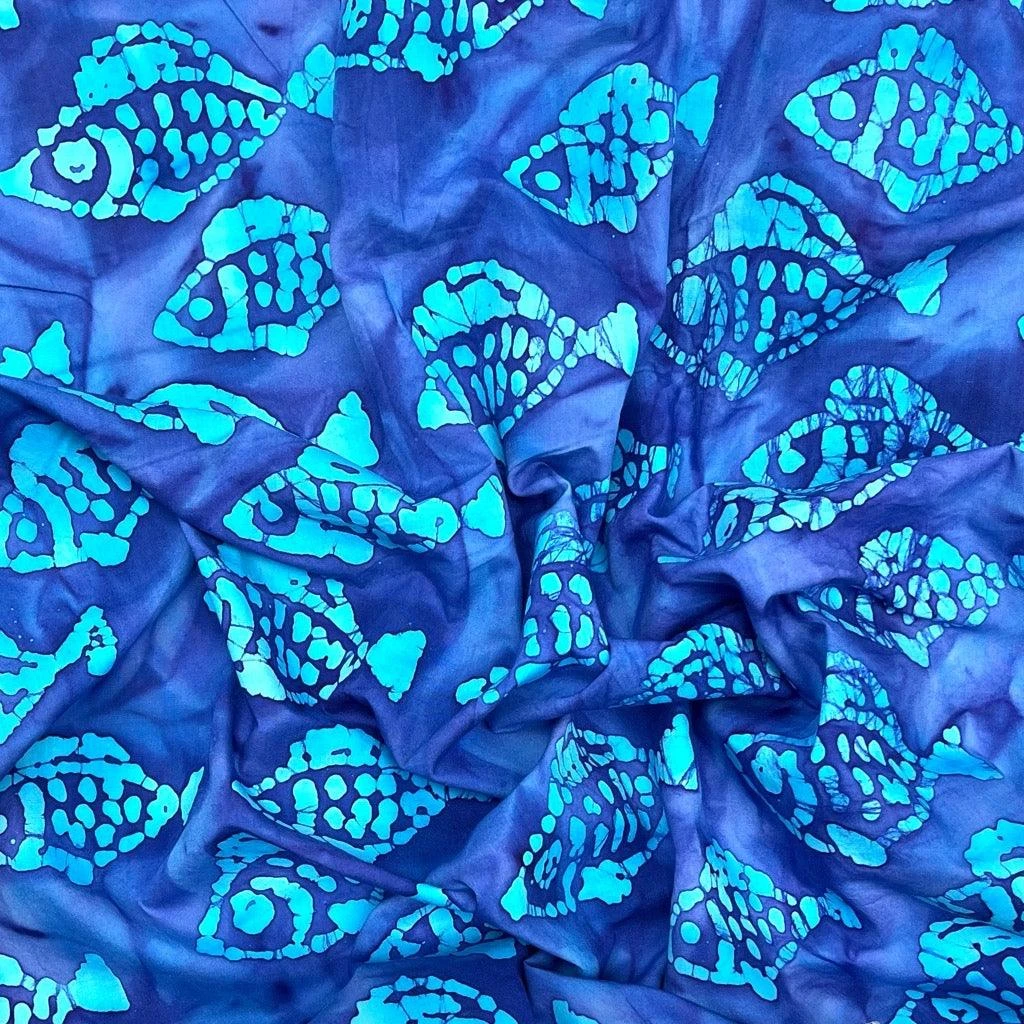 A high quality 100% cotton batik fabric featuring a fishes print. This John Louden fabric features a unique design with deep colours, hand printed by specialist craftsmen.