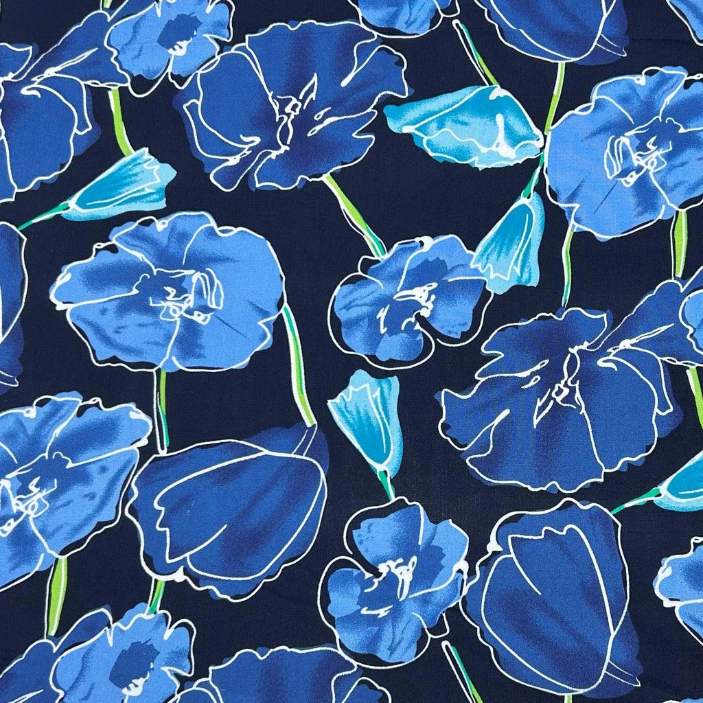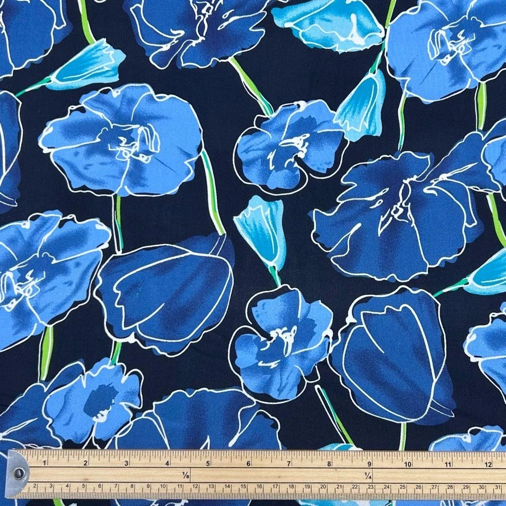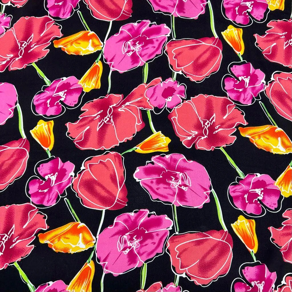 A viscose challis fabric featuring a flowers design on a black background. This fabric features a wonderful drape and would be great for tops, dresses, skirts, accessories and more! Available in 2 colours.