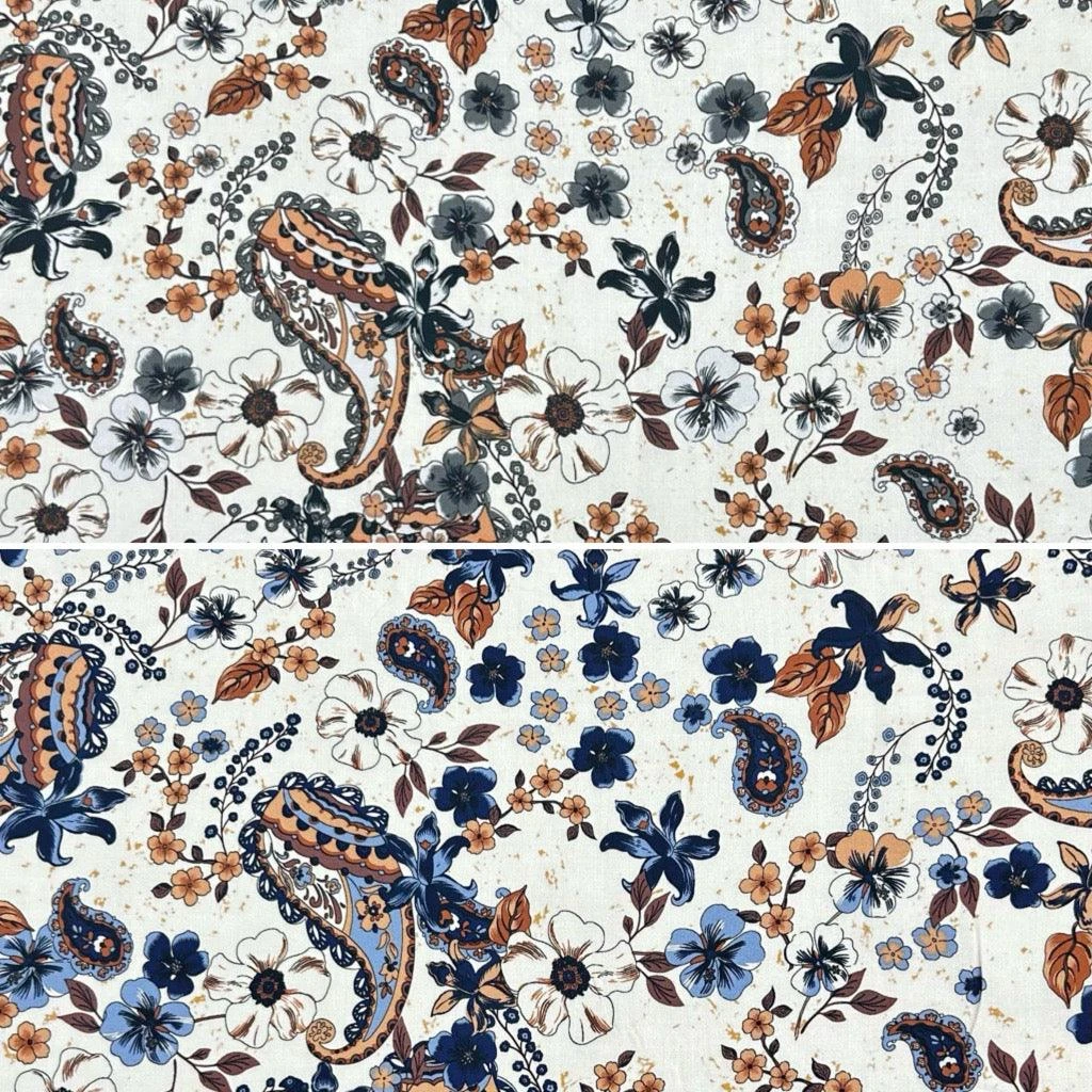 A high quality, digitally printed, viscose lawn fabric featuring a flower and paisley design available in 2 colours. This lightweight fabric’s wonderful drape, soft feel and breathability makes it ideal for a range of summer dressmaking projects including shirts, dresses, skirts, blouses and more!