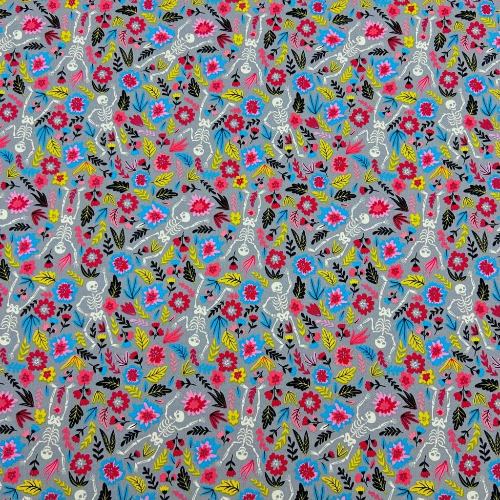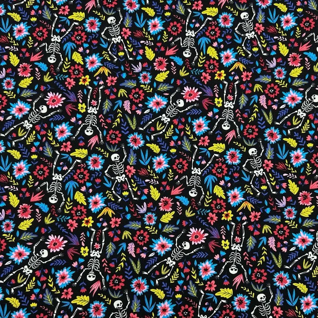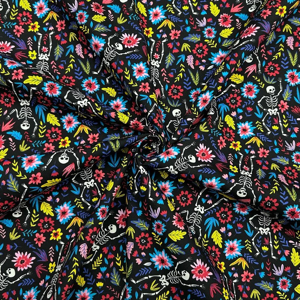 A Rose & Hubble cotton poplin fabric featuring dancing skeletons in a flower garden in its design. Suitable for tops, skirts, dresses, accessories and more! Available in 3 colours.