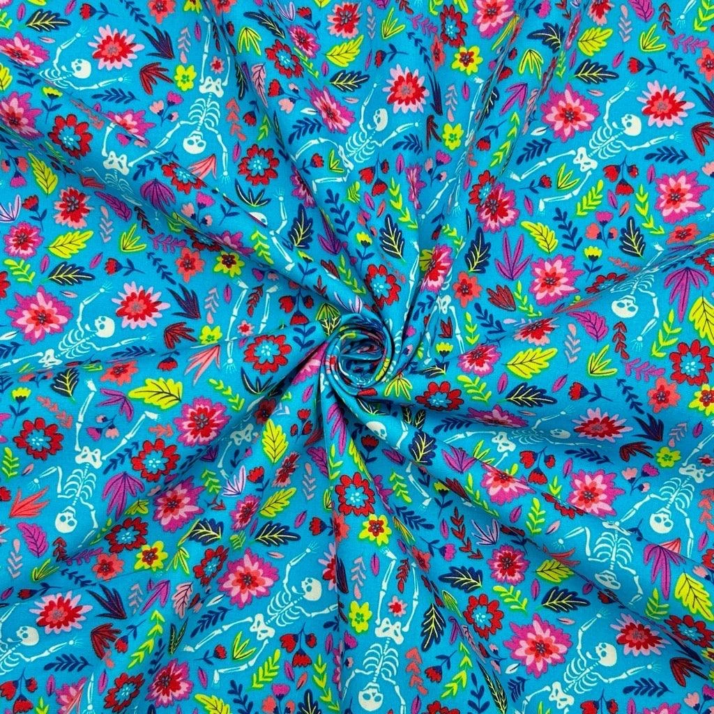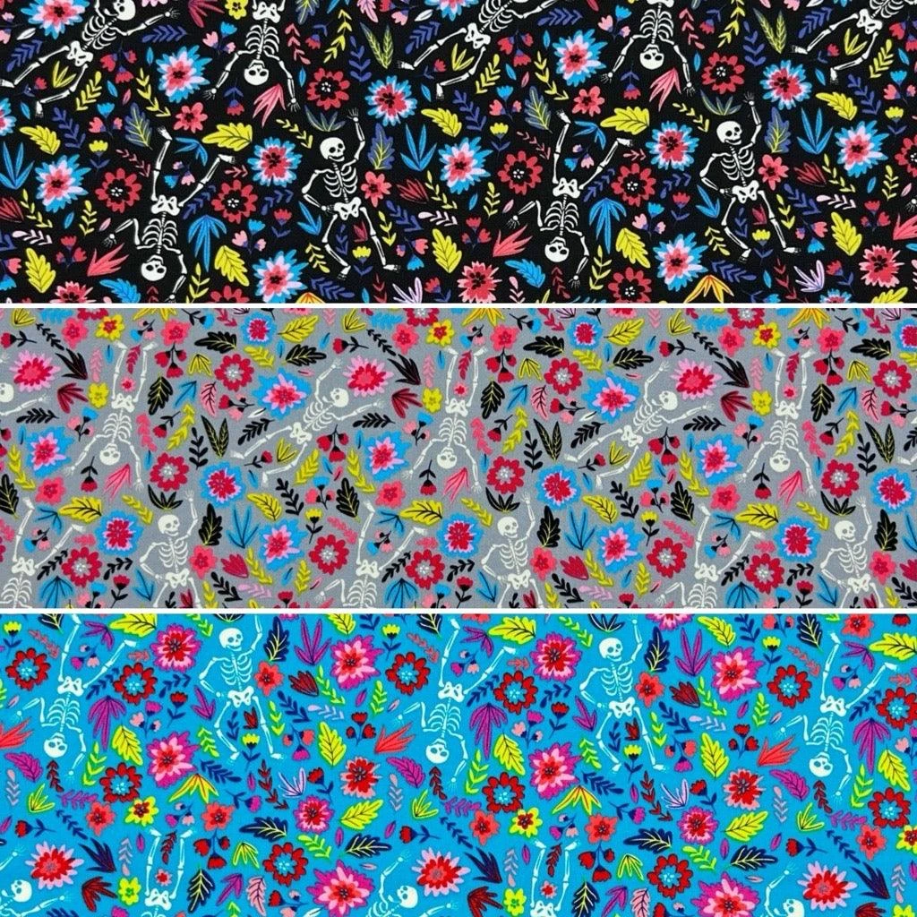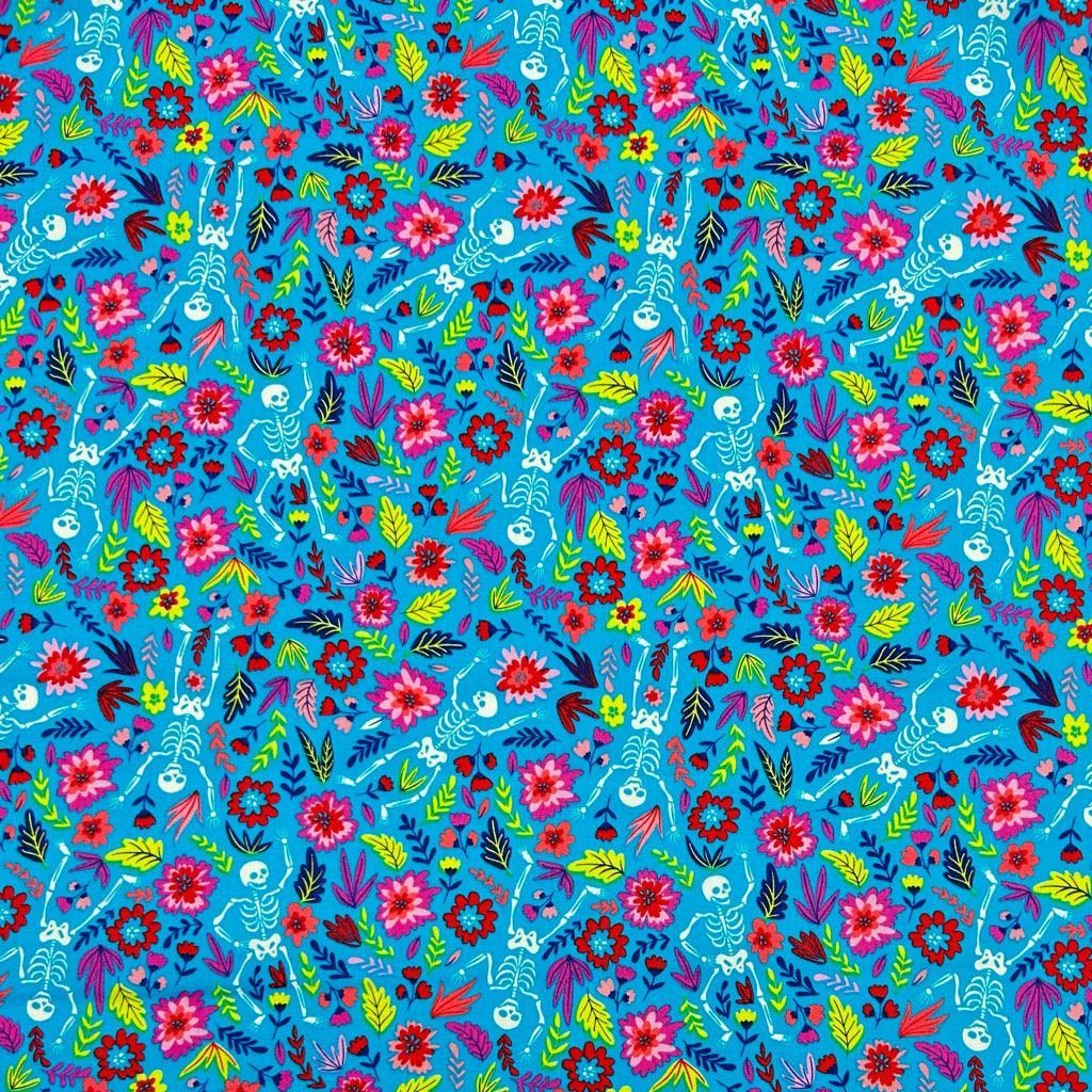 A Rose & Hubble cotton poplin fabric featuring dancing skeletons in a flower garden in its design. Suitable for tops, skirts, dresses, accessories and more! Available in 3 colours.