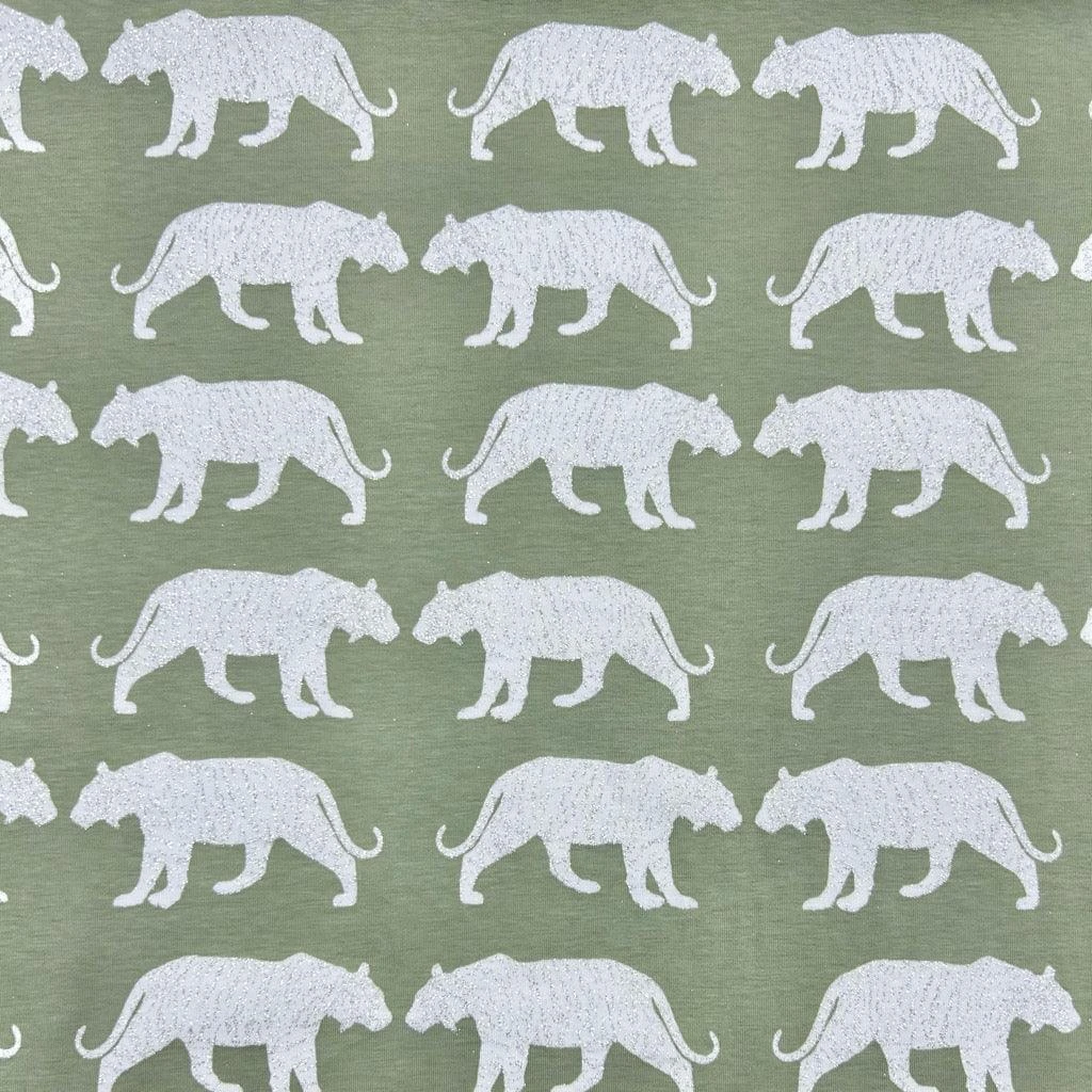A high quality cotton lycra fabric featuring a silver glitter tigers design on a sage green background. This fabric would be great for a range of dressmaking projects such as tops, dresses, skirts, pyjamas and more.Â