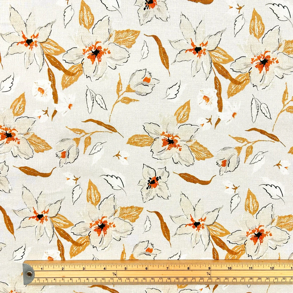 This gorgeous, digitally printed, lightweight fabric is a blend of cotton and natural ramie linen, featuring a flowers and leaves design. This fabric is durable and breathable, making it comfortable to wear. It also has a lovely drape and natural texture.