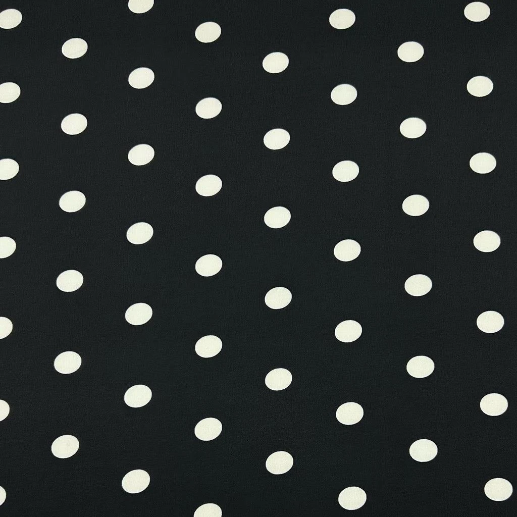A lightweight jersey fabric featuring an ivory dots design on a black background. This fabric would be suitable for leggings, tops, accessories and more!