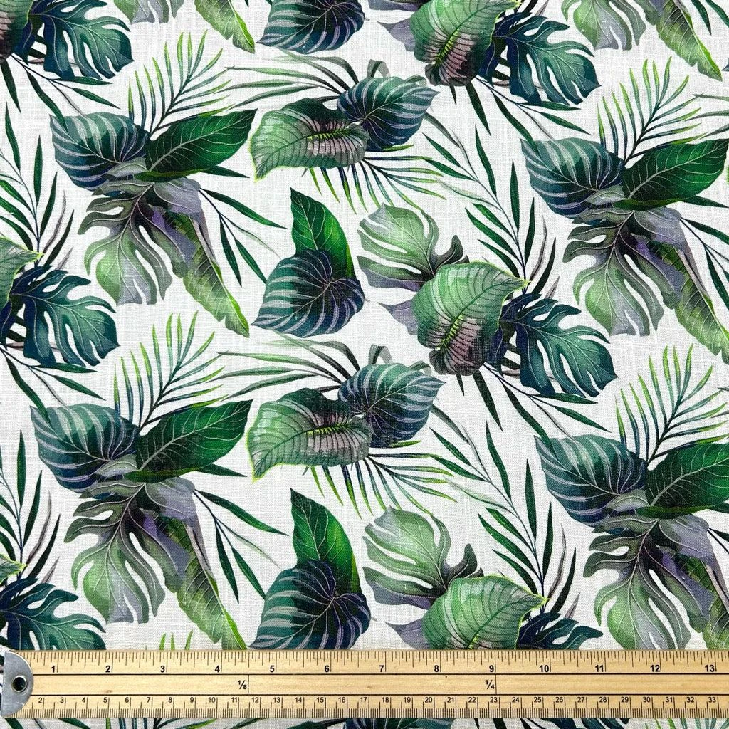 A linen viscose blend fabric featuring a stunning digitally printed jungle leaf design on a white background. The breathability of linen paired with the beautiful drape of viscose makes this fabric perfect for summer clothing.