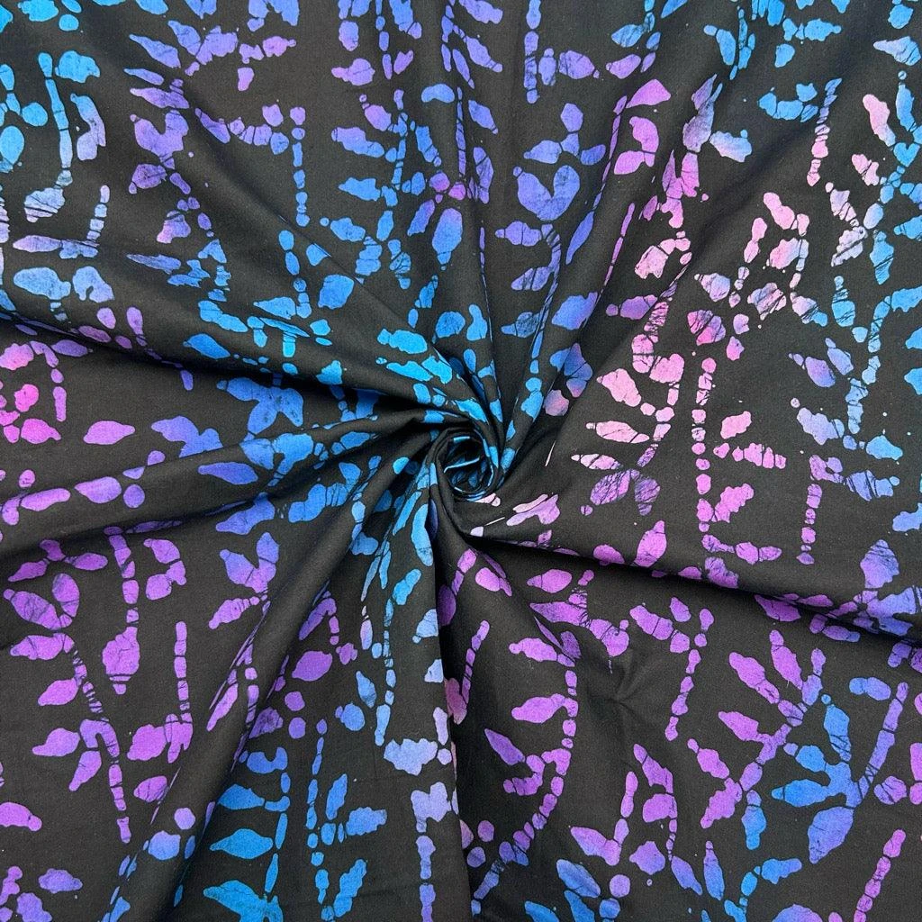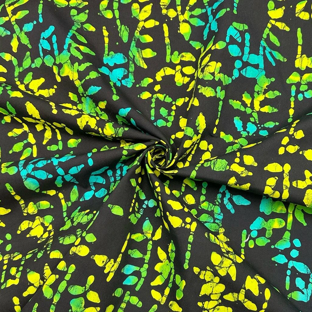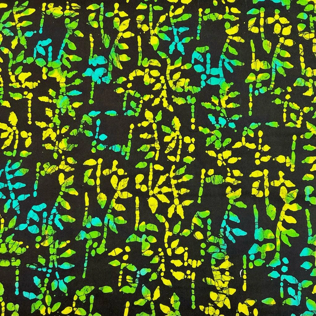 A high quality 100% cotton batik fabric featuring a leaves print on a black background. This John Louden fabric features a unique design with deep colours, hand printed by specialist craftsmen.