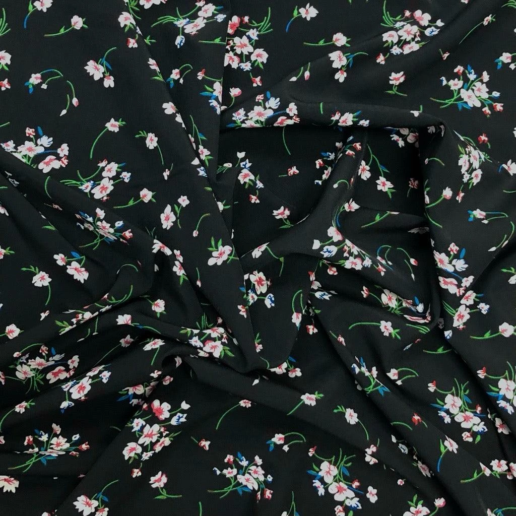 This polyester fabric features a mini flowers print and slightly stretches in both directions with greater stretch across the width. Suitable for a range of dress making projects such as tops, dresses, skirts, pyjamas and more.