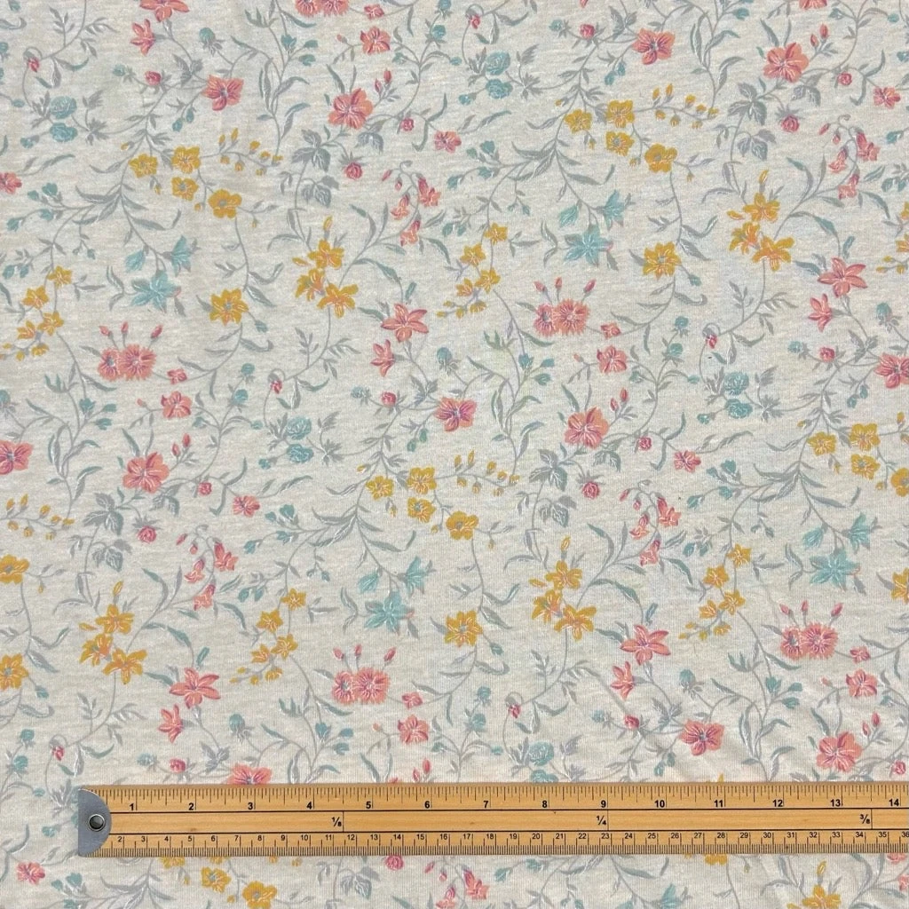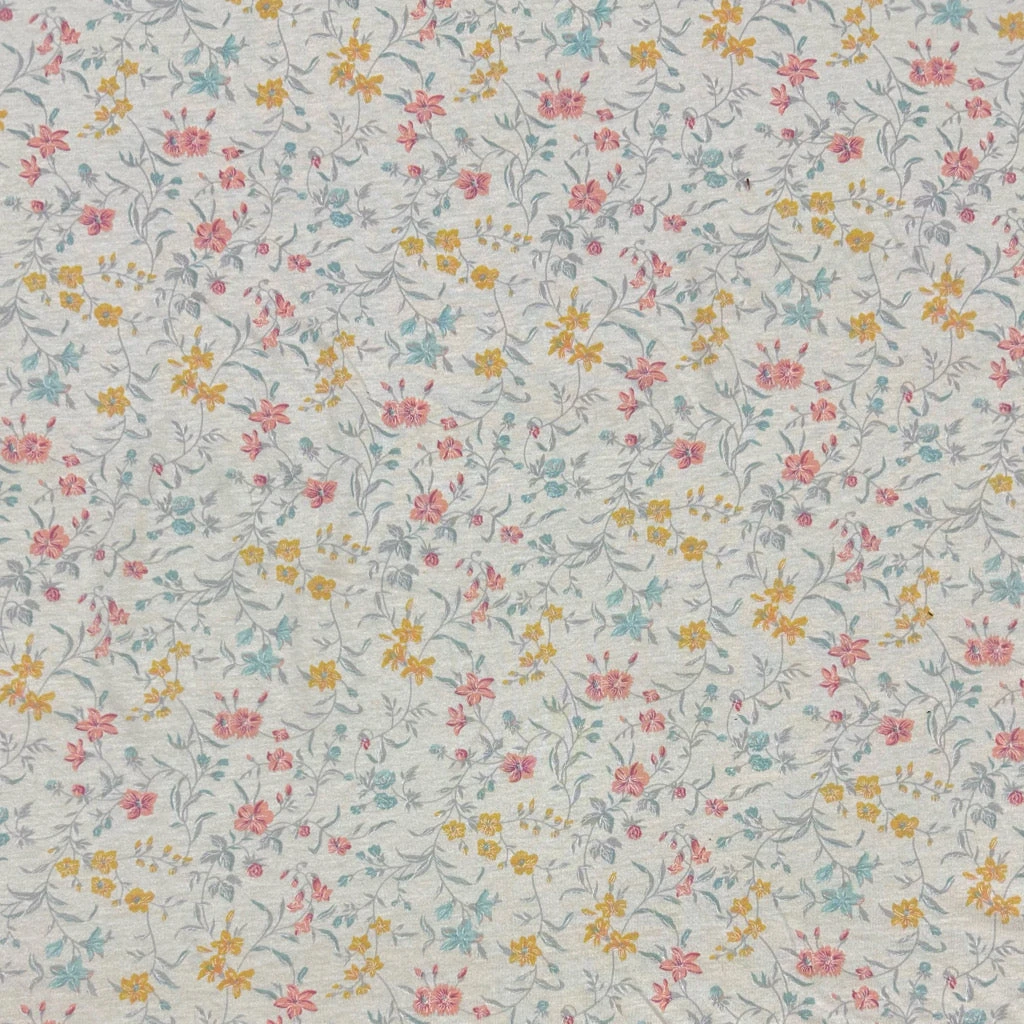 A high quality cotton knit fabric featuring a multicoloured flowers design on a light beige background. This fabric would be great for a range of dressmaking projects such as tops, dresses, skirts, pyjamas and more.