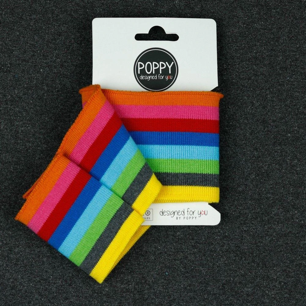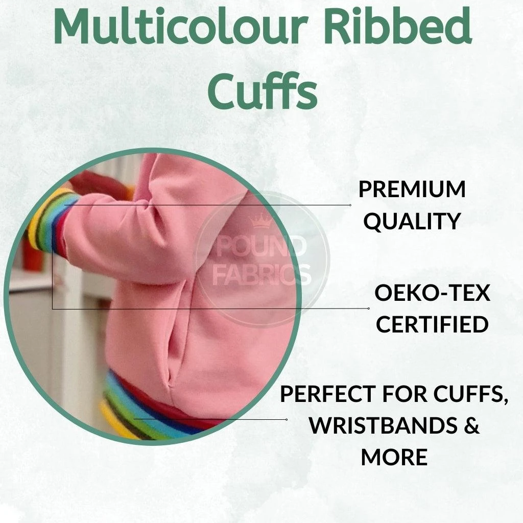 A high quality ribbed cuffing fabric made of cotton and elastane, featuring multicoloured stripes. Perfect for cuffs, wristbands, headbands and more! This ribbing fabric is 7cm wide and comes as a pre-cut 135cm piece.