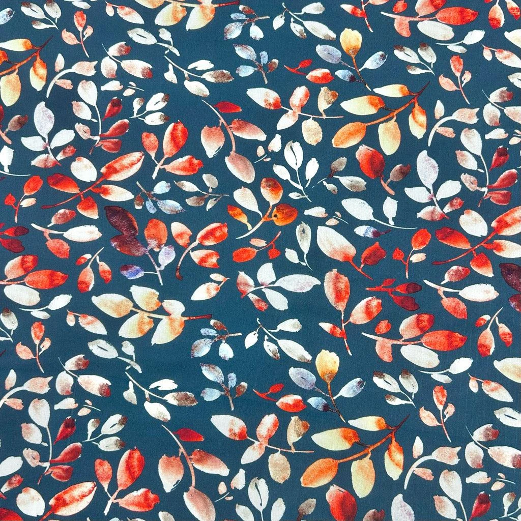 A high quality digitally printed viscose challis fabric featuring a leaf design. This fabric features a wonderful drape and would be perfect for summer tops, dresses, skirts, accessories and more! Available in 3 colours.
